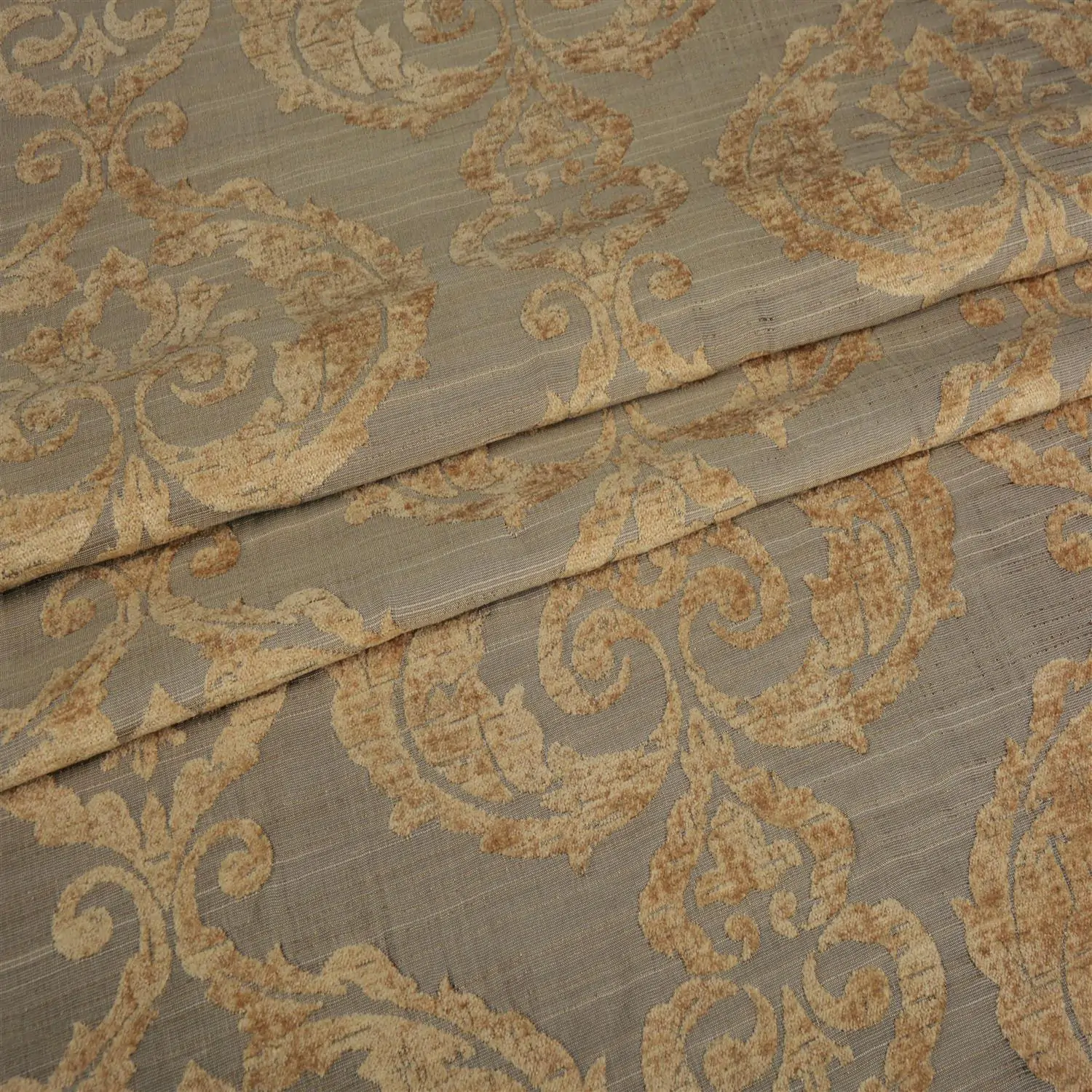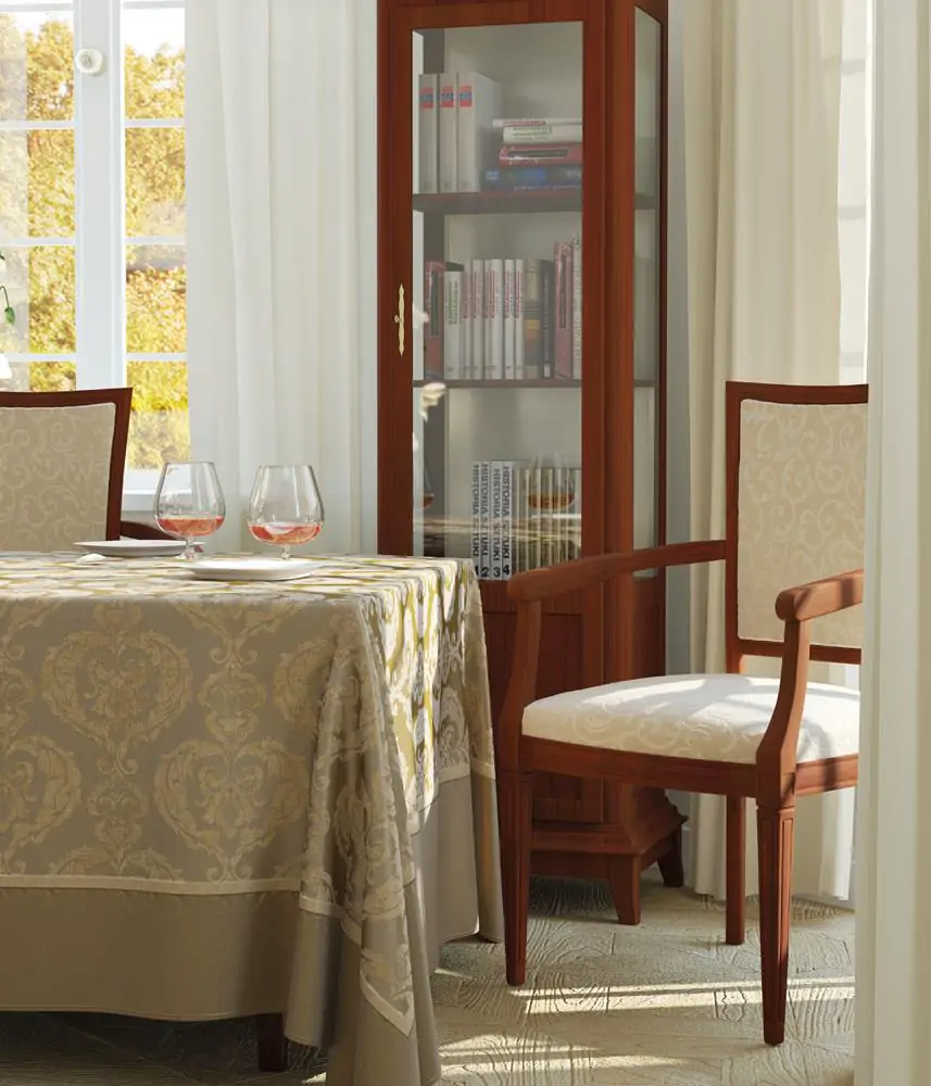Two-layer jacquard decorative fabric in thirteen colours of precious stones, with classic medallion pattern. Combination of traditional viscose chenille with modern plain background. Extremely elegant and soft to the touch. Recommended for stylish decoration of private interiors.