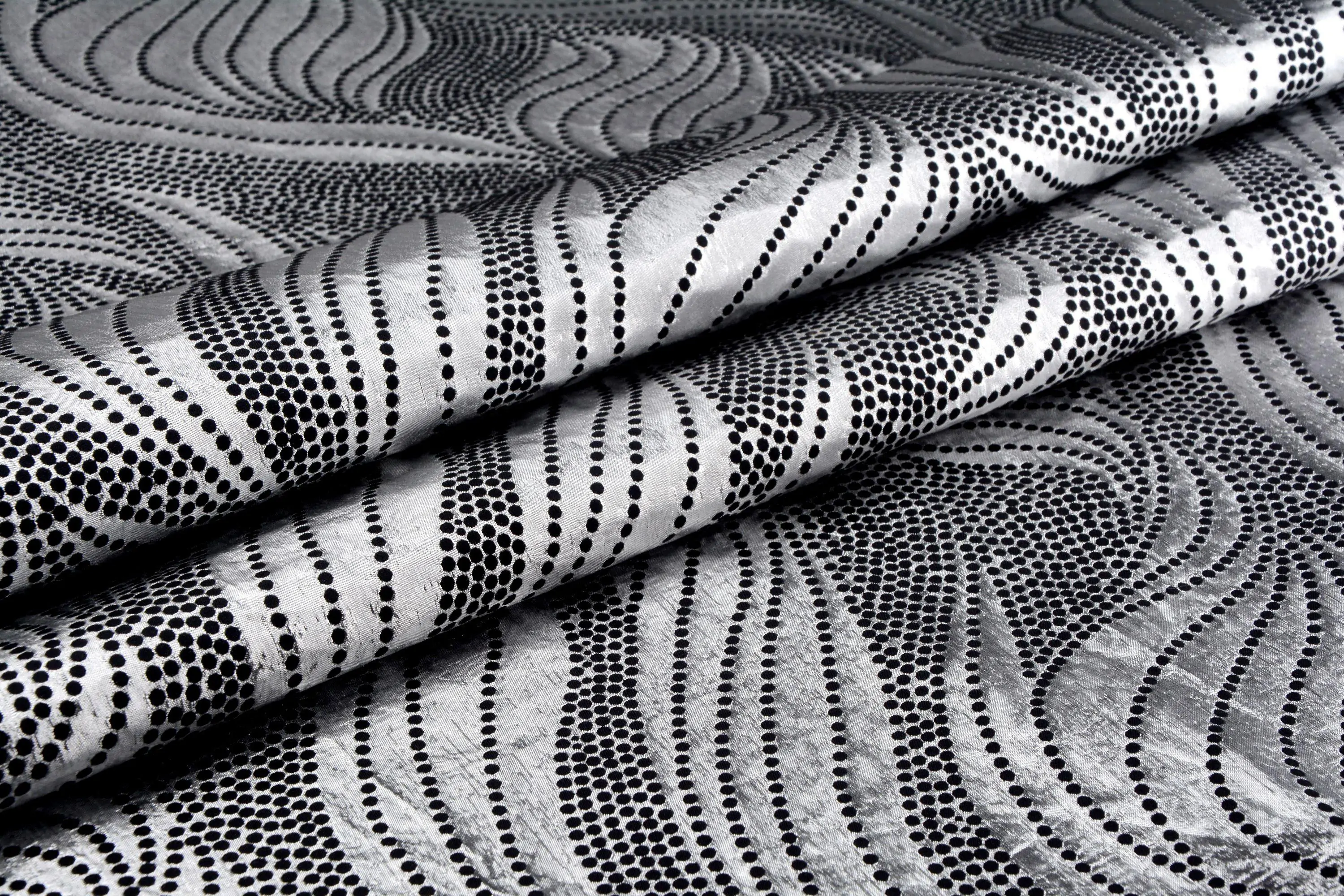 Covering decorative fabric with graphic modern pattern, impressively shimmering on a matt background. The collection is complemented by METAL haberdashery collection.