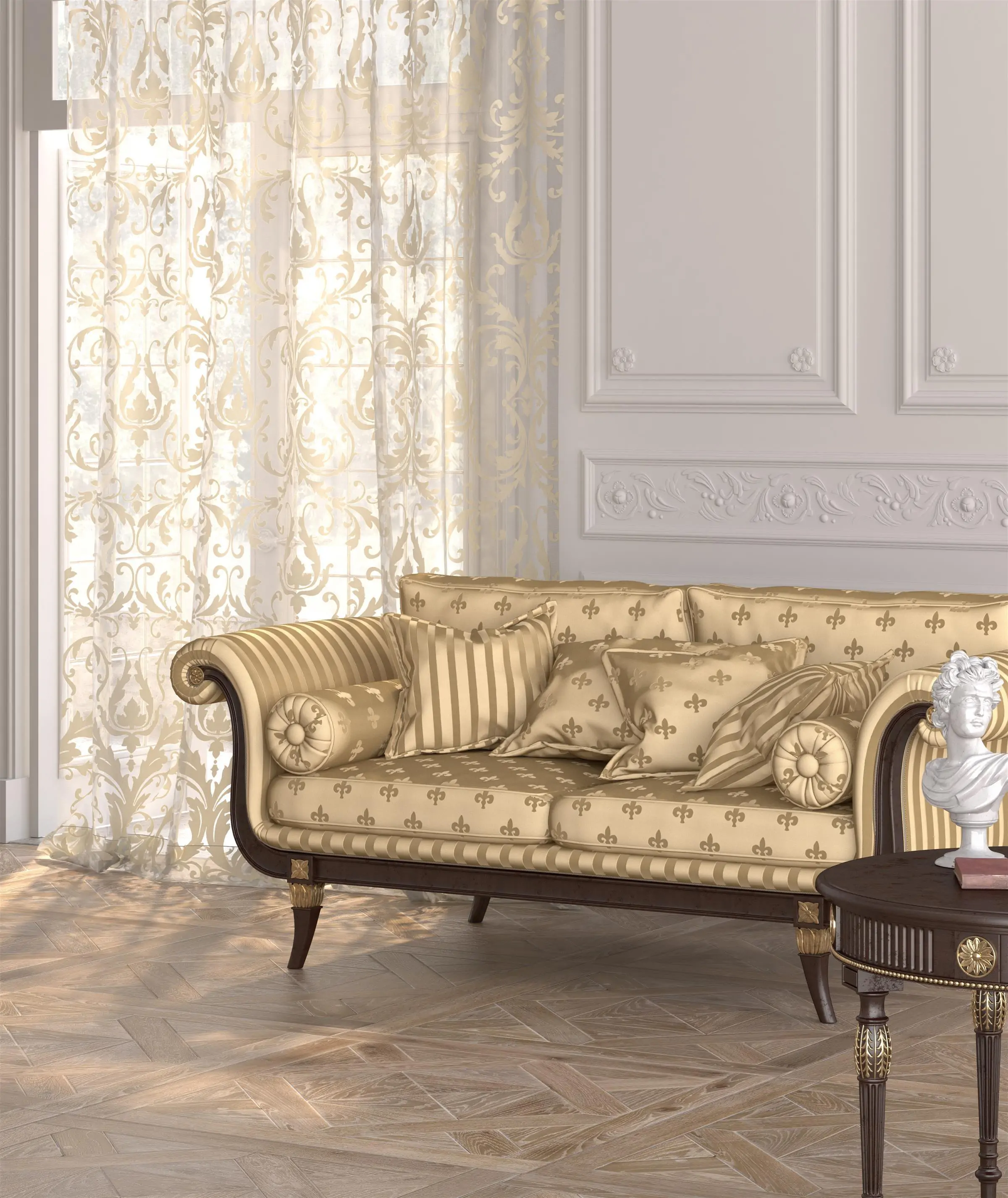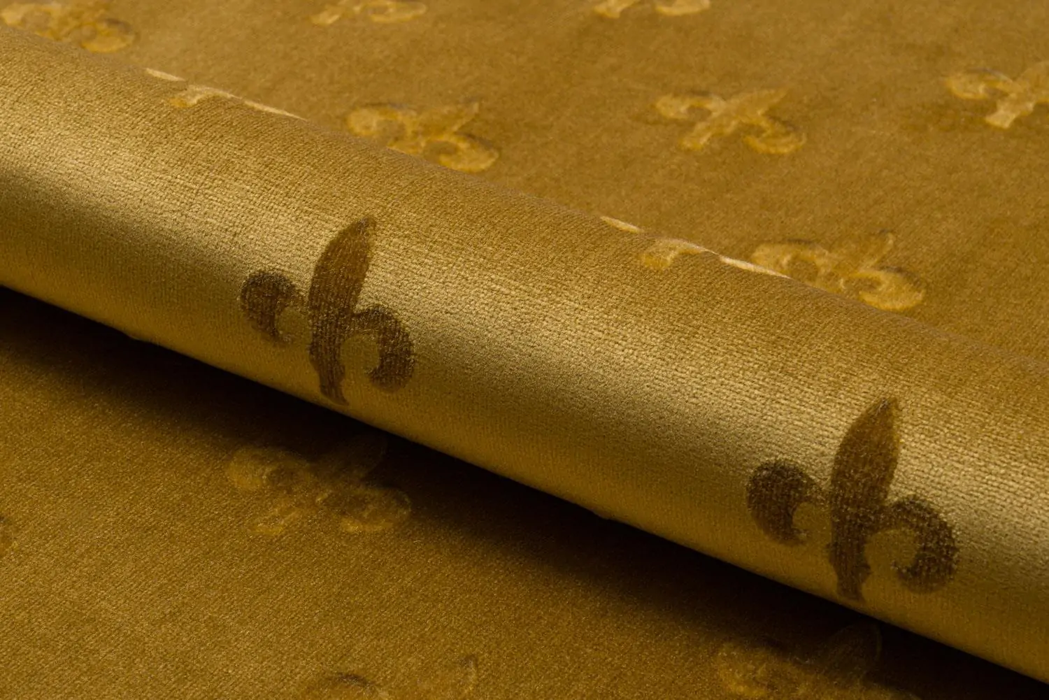 Plush upholstery fabric with convex pattern of heraldic lily (fleur-de-lis), a well-known theme of the old coats of arms. Available in ten colours, recommended for private interiors of classic and stylish character. Trends 2015: Memory.