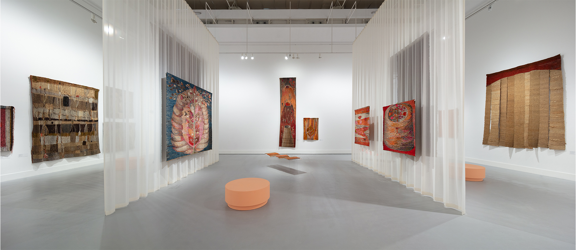 The exhibition presents a selection of 20 works by the artist, created between 1953 and 2018 – her most important pieces held in museum collections, complemented by lesser known tapestries from her private collection. Large scale works, including “Alleyway” (1962), created for the Lausanne Biennial, and the later “Blooming Hills” (1978), commissioned privately, are exhibited for the first time in over twenty years. The intention of curator Jędrzej Zakrzewski was to show the formal and stylistic transformations in Krystyna Wojtyna Drouet’s works – from figuration to abstraction and finally to the poetic works of her later years.