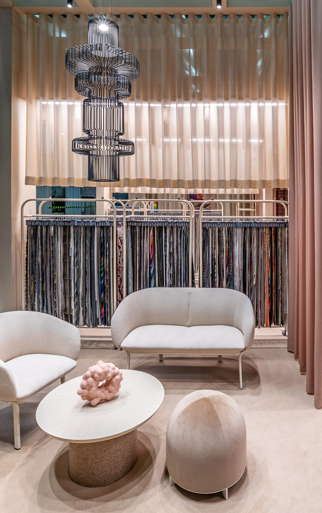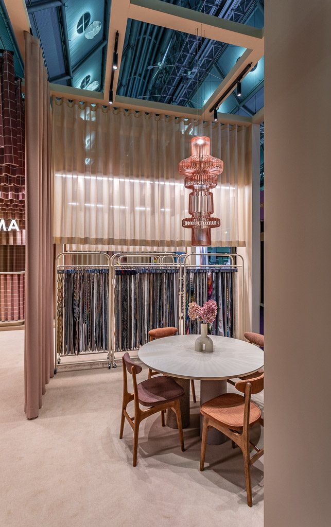 Our 100m2 exhibition stand boasted warm, pastel colours (referring to e.g. the Pantone® Colour of the Year – Peach Fuzz) featured in numerous drapes made from the Miami Grid velvet fabric. Lavishly pleated curtains hung in layers in the stand’s entrance zone and its main counter looked impressive due to the printed grid pattern emphasising their dimensionality. The depth effect and perspective were also underscored by the graded length of individual curtains, arranged from the shortest to the longest. Pink, powdery and rusty shades adorned floor coverings, furniture and curtains separating conversation stands (these were sewn from the Rigs fabric and Layla net curtains) and decorations.