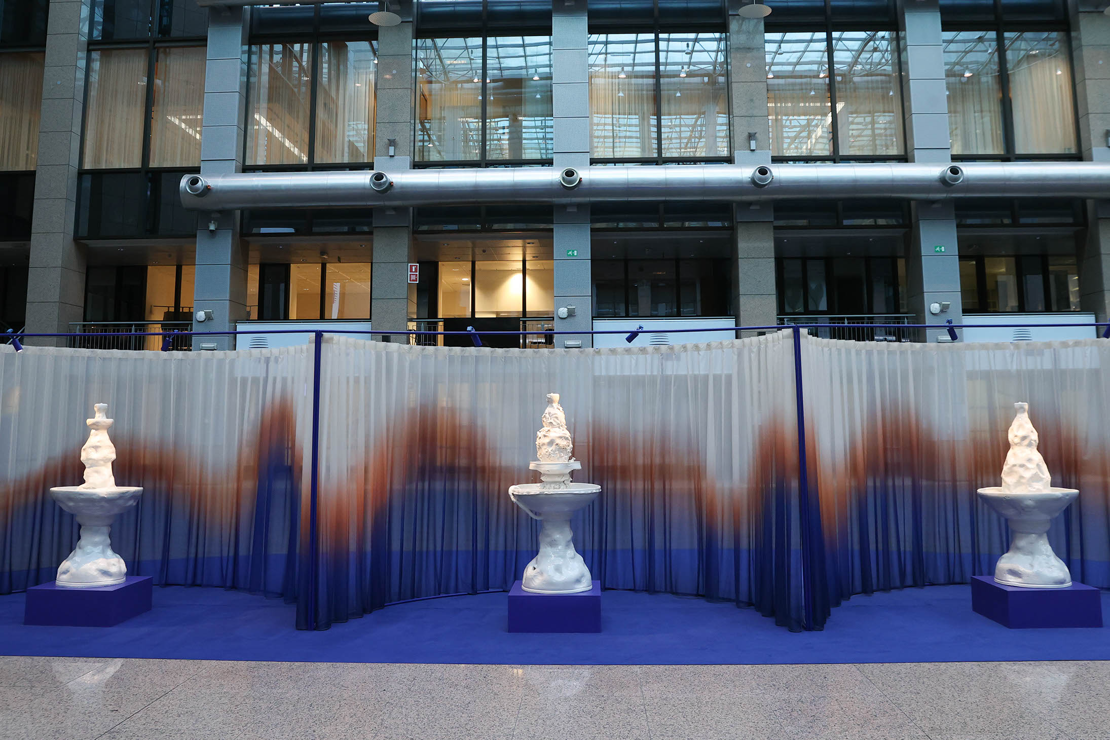“We Are The Weather” has been inspired by Jonathan Safran Foer’s book, “We Are the Weather: Saving the Planet Begins at Breakfast” (2019). The installation consists of three elements, which emphasise the urgent need for solidarity and collaboration in the face of global challenges. The ceramic fountains tell the story of climate change. The cobalt “water catchers” remind visitors that water is a priceless and life-giving resource and the ceramic tiles illustrate its scarcity. The setting for the installation has been arranged by designers from the Supergirls Do Design studio. They have connected Alicja Patanowska’s ceramic objects with a fluid line, reminiscent of water. The wave, represented in the shape of the carpeting, construction elements and the delicate Piuma fabric, printed in a specially designed gradient, guides viewers along the Justus Lipsius atrium, providing direction to the exhibition.