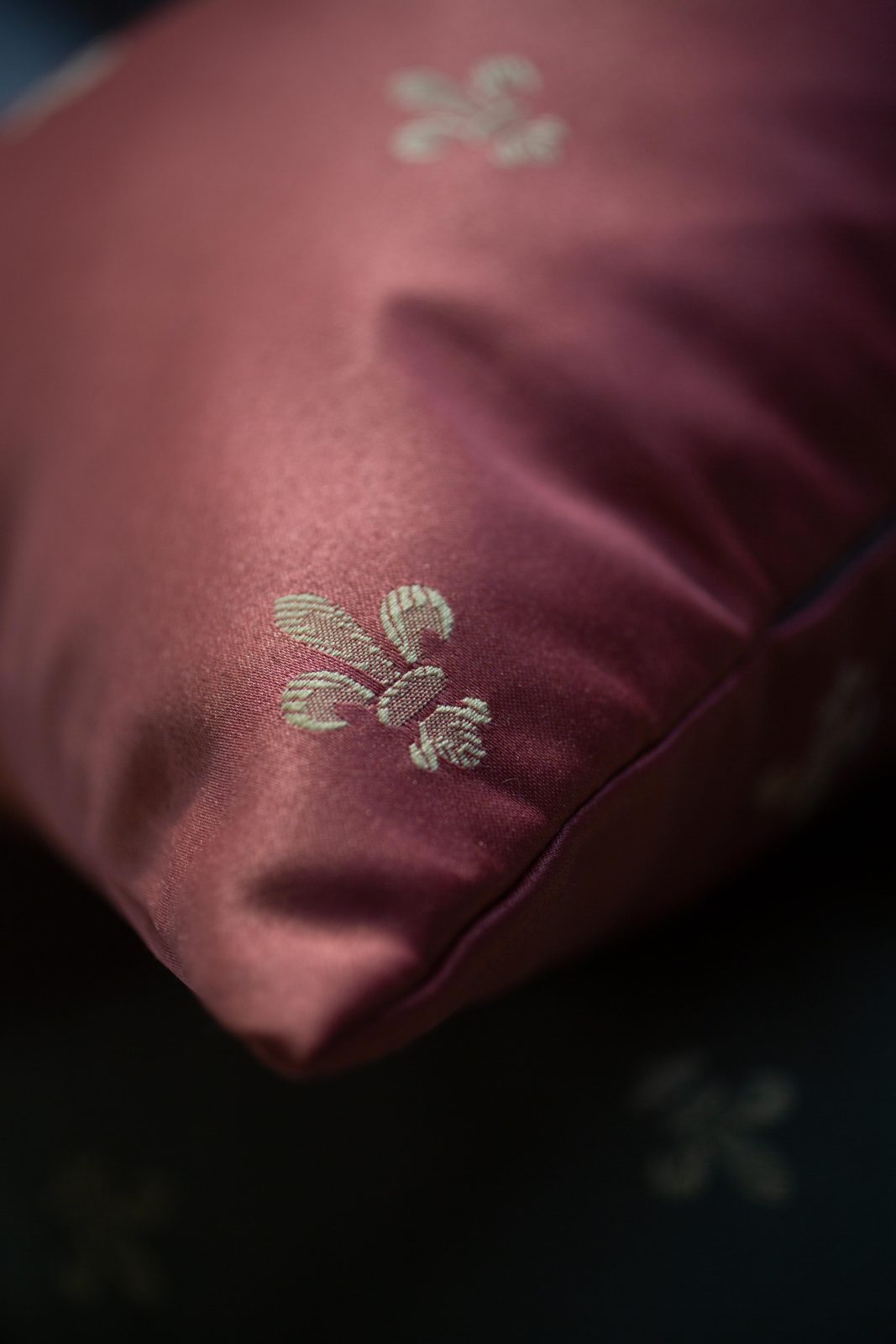 Dodatkowe delikatne paseczki w ciemniejszym odcieniu dają efekt gradientu i trójwymiarowości wzoru, a utkane żakardowo lilijki są subtelnym detalem, podkreślającym klasyczny charakter tkaniny.