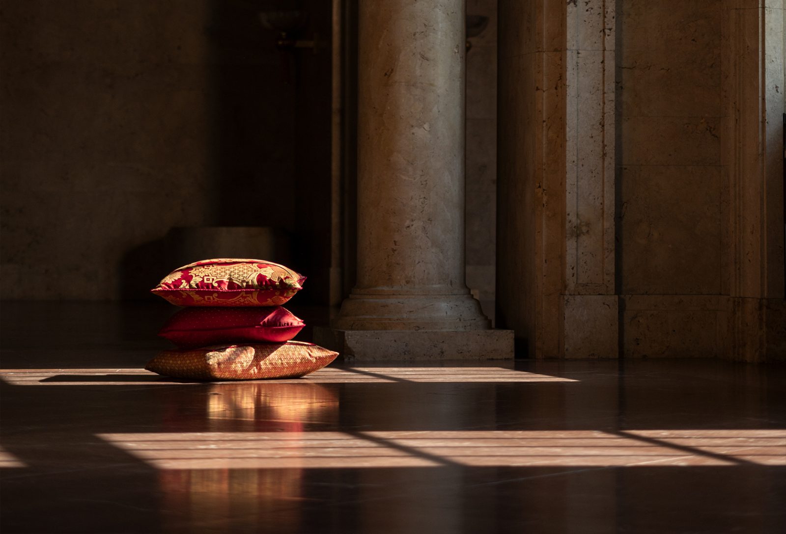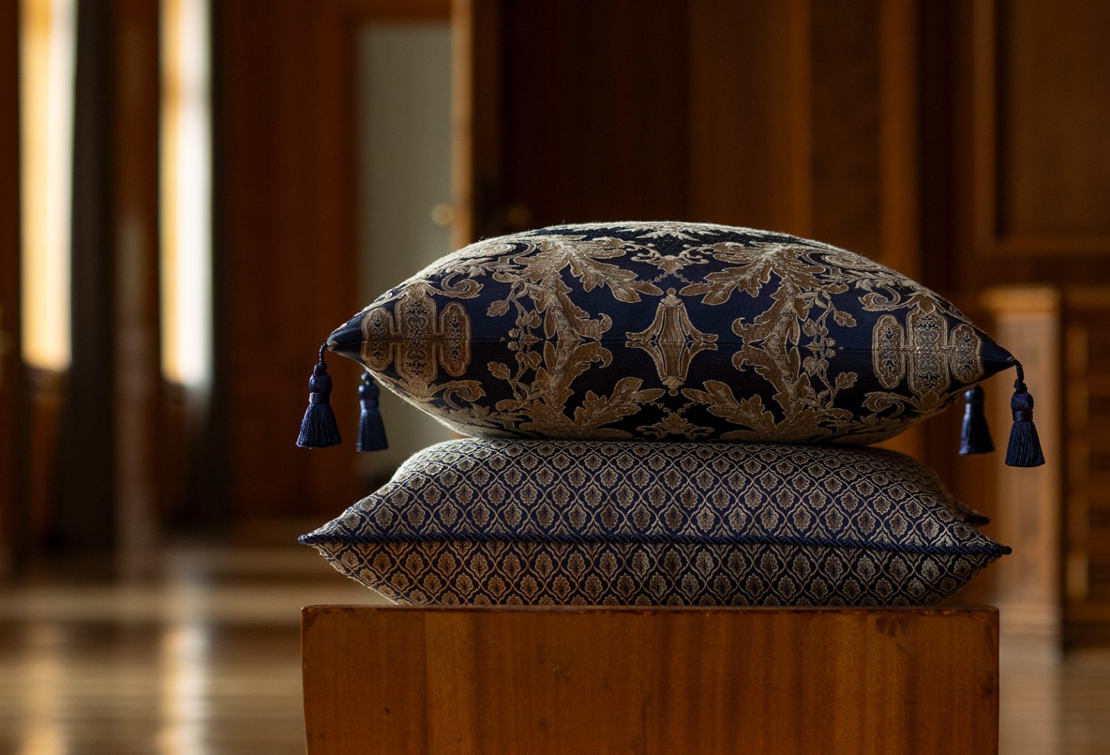 Wykonane z marmuru posadzki i schody, wykute w kamieniu kolumny i dekoracyjne płaskorzeźby, misternie wykonane boazerie – wnętrza Zamku Cesarskiego imponują rozmachem i mieszanką nawiązań do architektury romańskiej, mauretańskiej oraz bizantyjskiej. Szczególnie monumentalne są klatki schodowe oraz sala tronowa. Zrealizowana w takim otoczeniu sesja, której autorem był Cezary Hładki, a stylistką Małgorzata Bernady z MBBM Studio, pozwoliła ukazać eleganckie tekstylne dodatki w całej okazałości i w pełnej gamie zastosowań. Różnorodność wzorzystych tkanin, bogate tekstylne zdobienia i pałacowy charakter wnętrz stworzyły wyjątkową, inspirującą kompozycję.