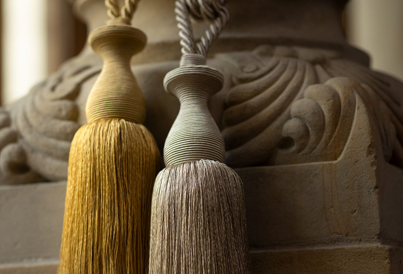 Kolekcja Elegance to taśmy, frędzle, chwosty i sznury, które można śmiało zestawiać z najbardziej luksusowymi tkaninami dekoracyjnymi i tapicerskimi. Ponadczasowy charakter tych dodatków sprawdzi się w bogatych, pełnych detali stylizacjach, inspirowanych historycznymi stylami czy pokazujących współczesne oblicze przepychu. Metaliczne nici i wiskozowe włókna przykuwają uwagę swoim połyskiem zarówno w słonecznym świetle, jak i po zmroku.
