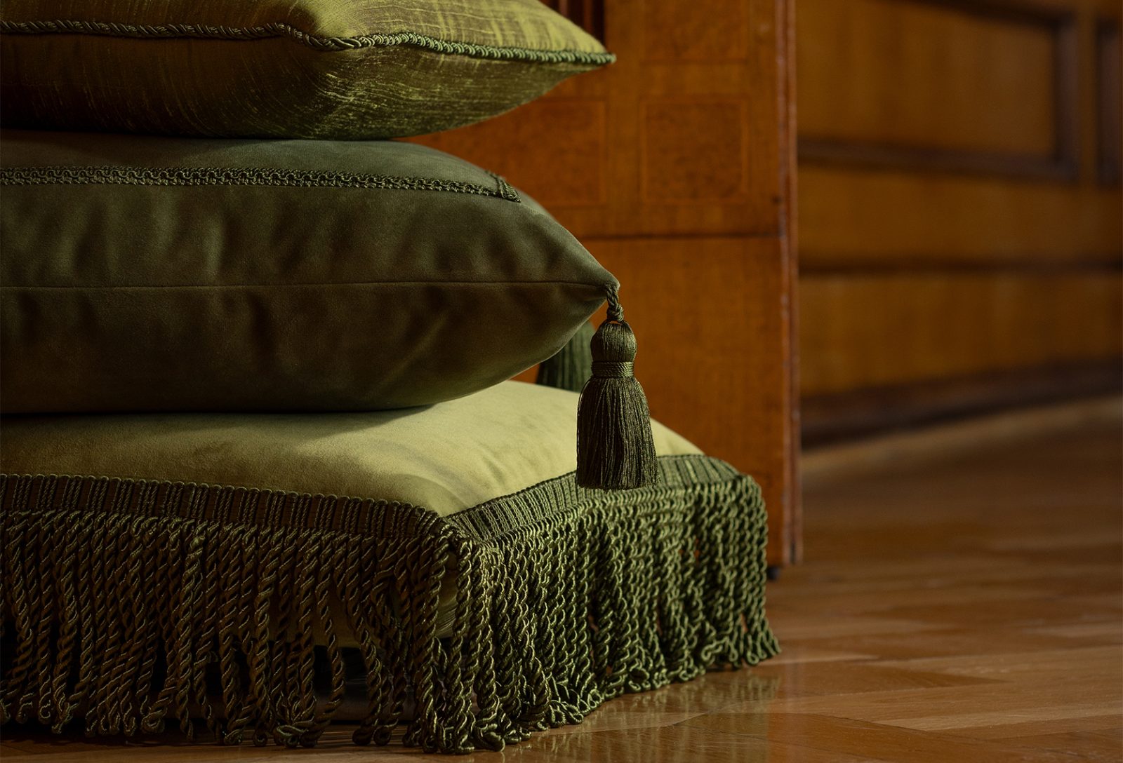 Kolekcja klasycznych pasmanteryjnych dodatków Elegance to frędzle, sznury, chwosty i taśmy o wyrazistych kolorach i formach oraz charakterystycznym połysku, typowym dla wiskozowej przędzy. Można je wykorzystywać do dekorowania mebli tapicerowanych, poduszek, kotar, zasłon, wałków czy serwet. Ze względu na swój charakter pasują nawet do najbardziej bogatych i zdobnych tkanin, takich jak welury, adamaszki czy gobeliny.