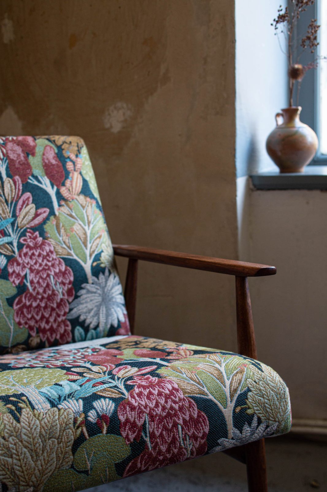 Klasyczny, dekoracyjny gobelin o żakardowym splocie, któremu współczesny charakter nadaje fantazyjny, botaniczny wzór i oryginalna kolorystyka. To przełamanie tradycyjnego wizerunku gobelinów pozwala „odczarować” ten rodzaj tkanin i wpisuje je w aktualne trendy wnętrzarskie.