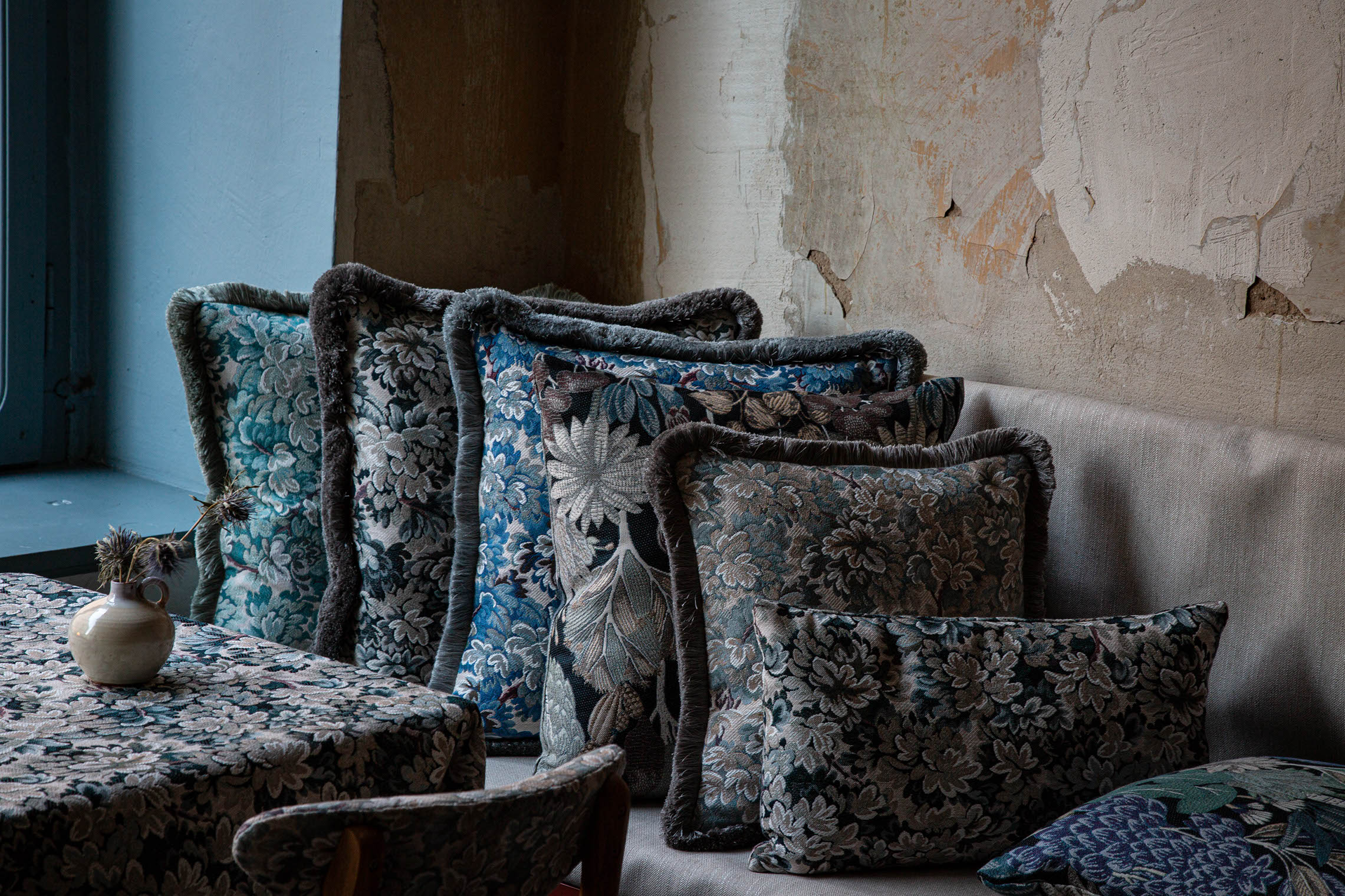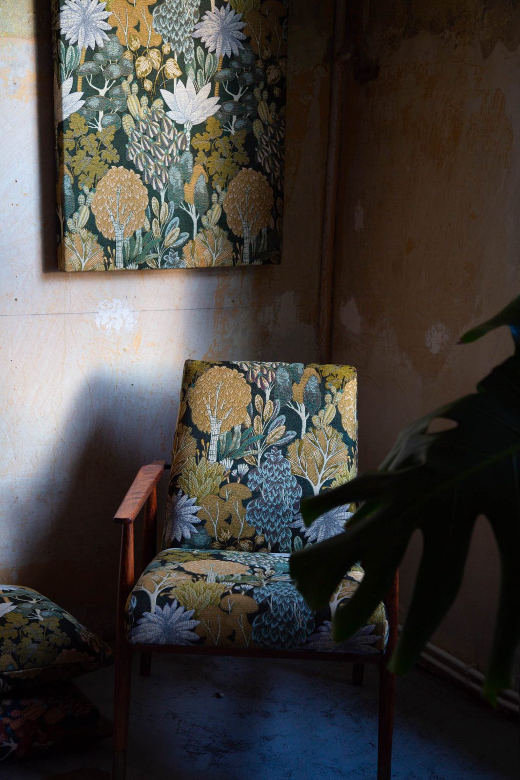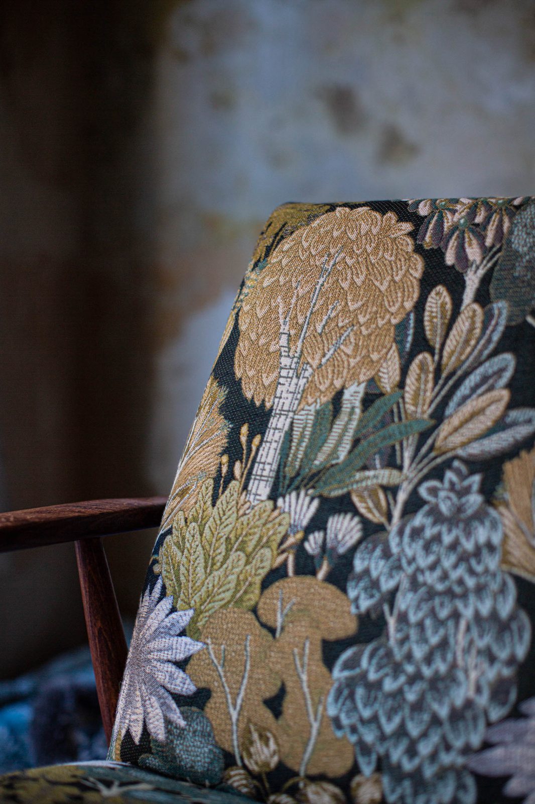 Klasyczny, dekoracyjny gobelin o żakardowym splocie, któremu współczesny charakter nadaje fantazyjny, botaniczny wzór i oryginalna kolorystyka. To przełamanie tradycyjnego wizerunku gobelinów pozwala „odczarować” ten rodzaj tkanin i wpisuje je w aktualne trendy wnętrzarskie.