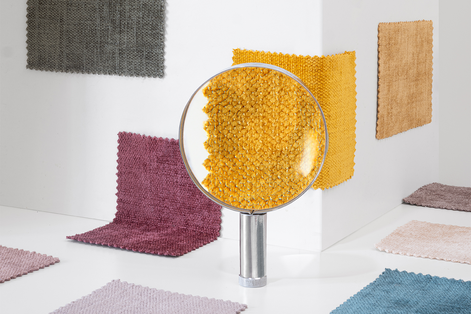 Uwagę zwraca charakterystyczna struktura materiały. Lekko połyskliwe włókno, ułożone w regularne kępki, daje wizualny efekt mieniących się w świetle, drobnych łusek – zupełnie jakby na skórze ryby czy niewielkiego gada. Gdy dotkniemy tkaniny jest mięsista, miękka i gładka – to zasługa szenilowego włókna.