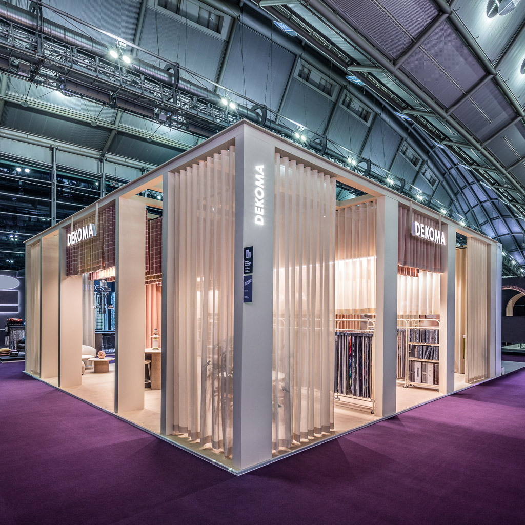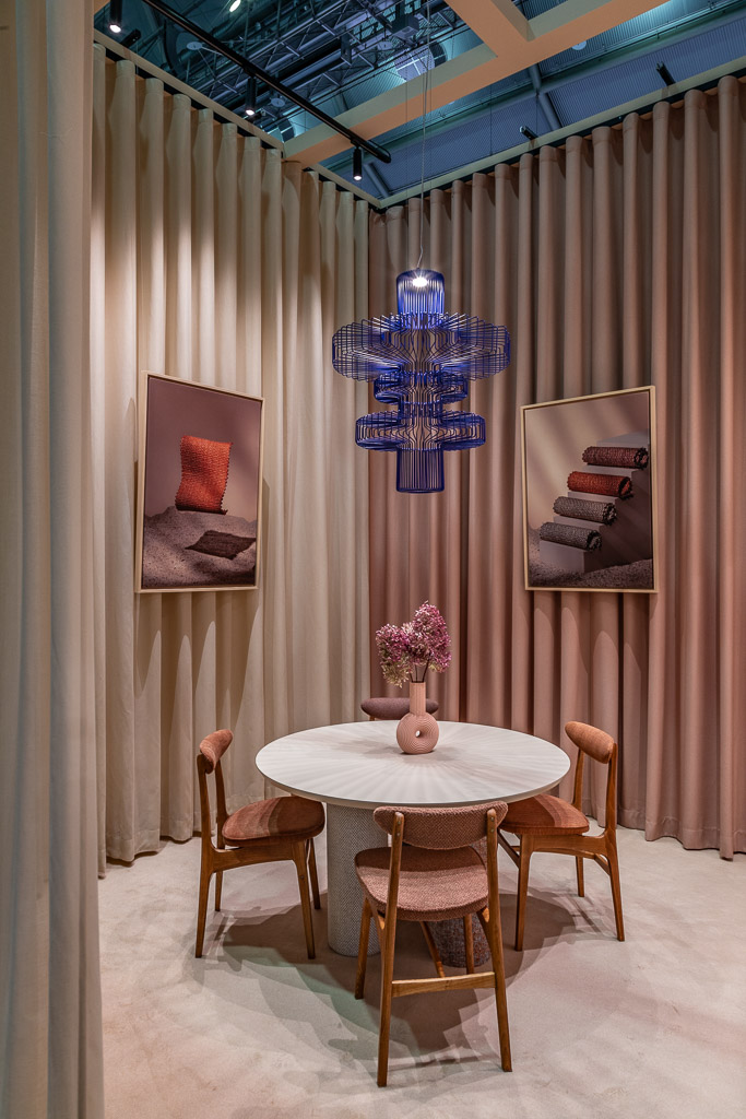 Nasze targowe stoisko miało powierzchnię 100m2. Utrzymane było w ciepłych, pastelowych tonacjach (nawiązując choćby do Koloru Roku Pantone® Peach Fuzz), a to m. in. dzięki licznym draperiom z welurowej tkaniny Grid w odcieniu Miami. Bogato marszczone kotary, zawieszone warstwowo w strefie wejścia na stoisko i jego głównej recepcji, wyglądały efektownie dzięki uwypuklającej ich przestrzenność siatce drukowanego wzoru. Efekt głębi i perspektywę podkreślała też stopniowanie długości poszczególnych kotar: od najkrótszych do najdłuższych. Różowe, pudrowe i rdzawe odcienie miały też wykładziny, meble, kotary wydzielające stanowiska do rozmów z klientami (te uszyte były z tkaniny Riga i firan Layla) oraz dekoracje.