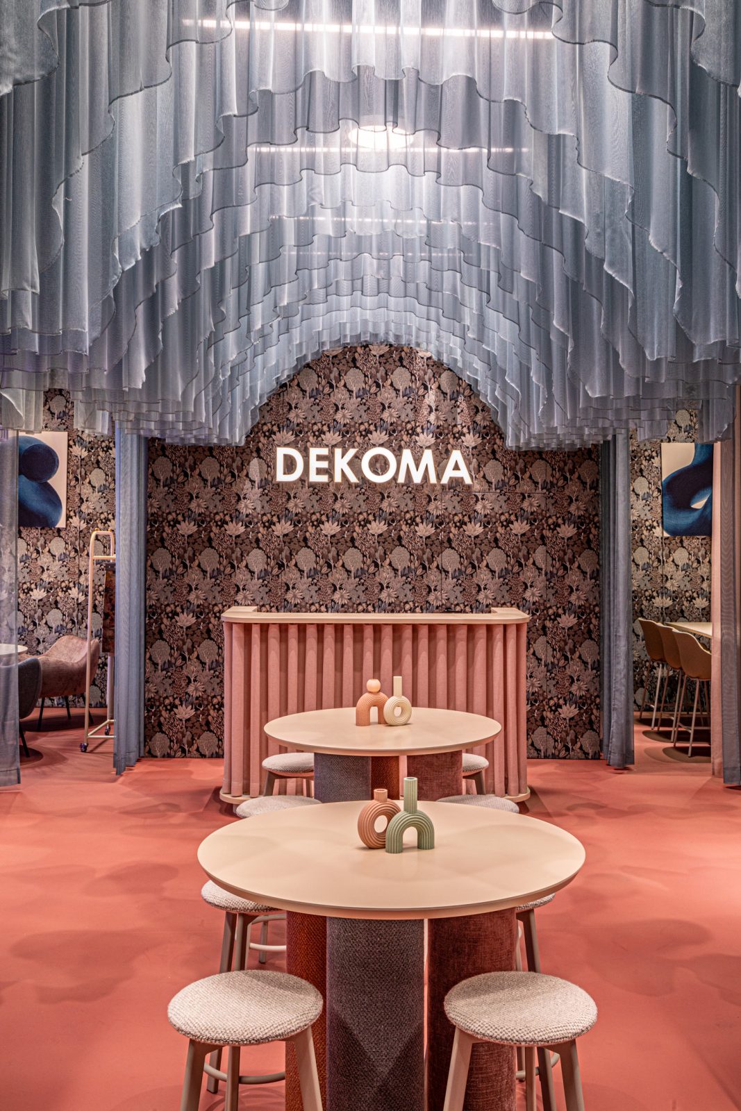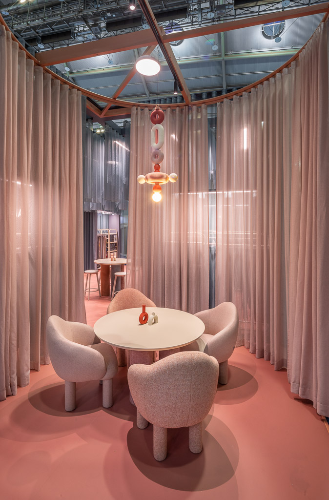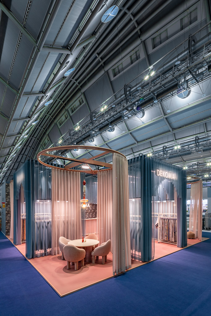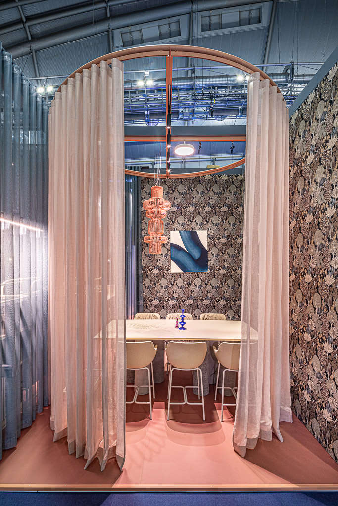 Stoisko, zostało zaprojektowane przez Łukasza Umińskiego, który zainspirował się wnętrzarskim maksymalizmem, pełnym kontrastów oraz mieszającym elementy różnych wnętrzarskich stylów. Projektant połączył wzorzysty, żakardowy gobelin Alberi z zasłonami z delikatnych tkanin dekoracyjnych Hoshi i Adara w pastelowych odcieniach. Ozdobione bogatym, roślinnym motywem Alberi pełniło rolę tekstylnej tapety. Z kolei zwiewne kotary z Hoshi i Adary wydzielały okrągłe miejsca do spotkań i ciągi komunikacyjne. Subtelne, transparentne tkaniny miały też podkreślać efemeryczność stoiska – budowanego na kilka dni – i zacierać wizualnie granice zajmowanej przez nie przestrzeni.