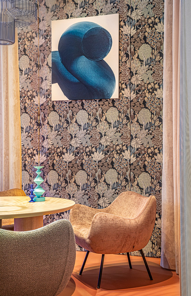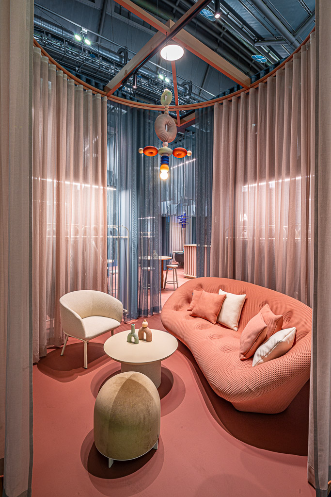 W kwestii wyposażenia stoiska konsekwentnie stawiamy na polski design i sztukę. Fotele to między innymi ikony polskiego designu – RM58, zaprojektowany w 1958 przez Romana Modzelewskiego, w odświeżonej, tapicerowanej wersji od Vzór, a także Dumbo – nowość od Motiv Home zaprojektowana przez Izę Brolę. Na stoisku można też było zobaczyć pufę Stado od Nurt, hokery Belem od Noti oraz Baltik z oferty MDD. Jedyny międzynarodowy wyjątek stanowiła w tym gronie kolejna ikona, sofa Ploum od Ligne Roset – odnowiona przez lokalnego tapicera na zamówienie marki Retronauci. Tkanina na tej sofie to dzianina Stilla, stworzona z myślą o meblach o obłych kształtach. Stoisko oświetliły lampy firm Chors i Flexxica oraz drukowane w technologii 3D lampy z PLA (bioplastik ze skrobii kukurydzianej, uzyskiwany w procesie recyklingu opakowań) projektu Utul Studio. Dzięki uprzejmości Utul Studio i Totem Studio na stolikach stanęły kolorowe, dekoracyjne totemy.