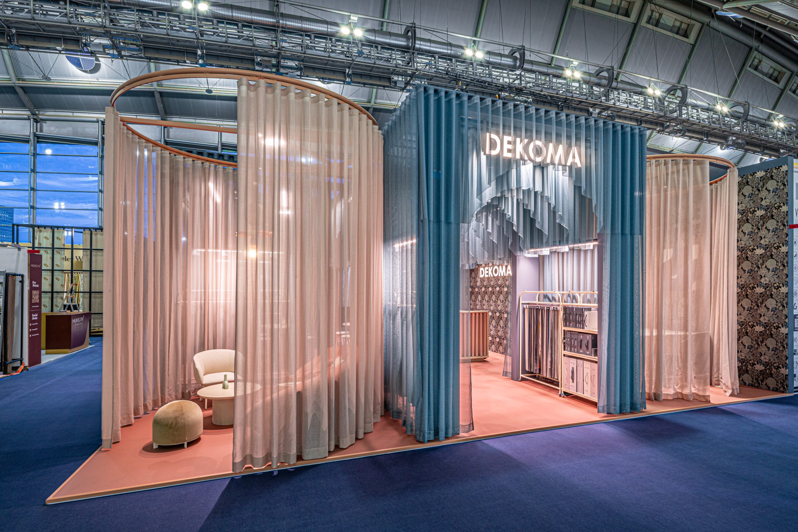 Stoisko, zostało zaprojektowane przez Łukasza Umińskiego, który zainspirował się wnętrzarskim maksymalizmem, pełnym kontrastów oraz mieszającym elementy różnych wnętrzarskich stylów. Projektant połączył wzorzysty, żakardowy gobelin Alberi z zasłonami z delikatnych tkanin dekoracyjnych Hoshi i Adara w pastelowych odcieniach. Ozdobione bogatym, roślinnym motywem Alberi pełniło rolę tekstylnej tapety. Z kolei zwiewne kotary z Hoshi i Adary wydzielały okrągłe miejsca do spotkań i ciągi komunikacyjne. Subtelne, transparentne tkaniny miały też podkreślać efemeryczność stoiska – budowanego na kilka dni – i zacierać wizualnie granice zajmowanej przez nie przestrzeni.