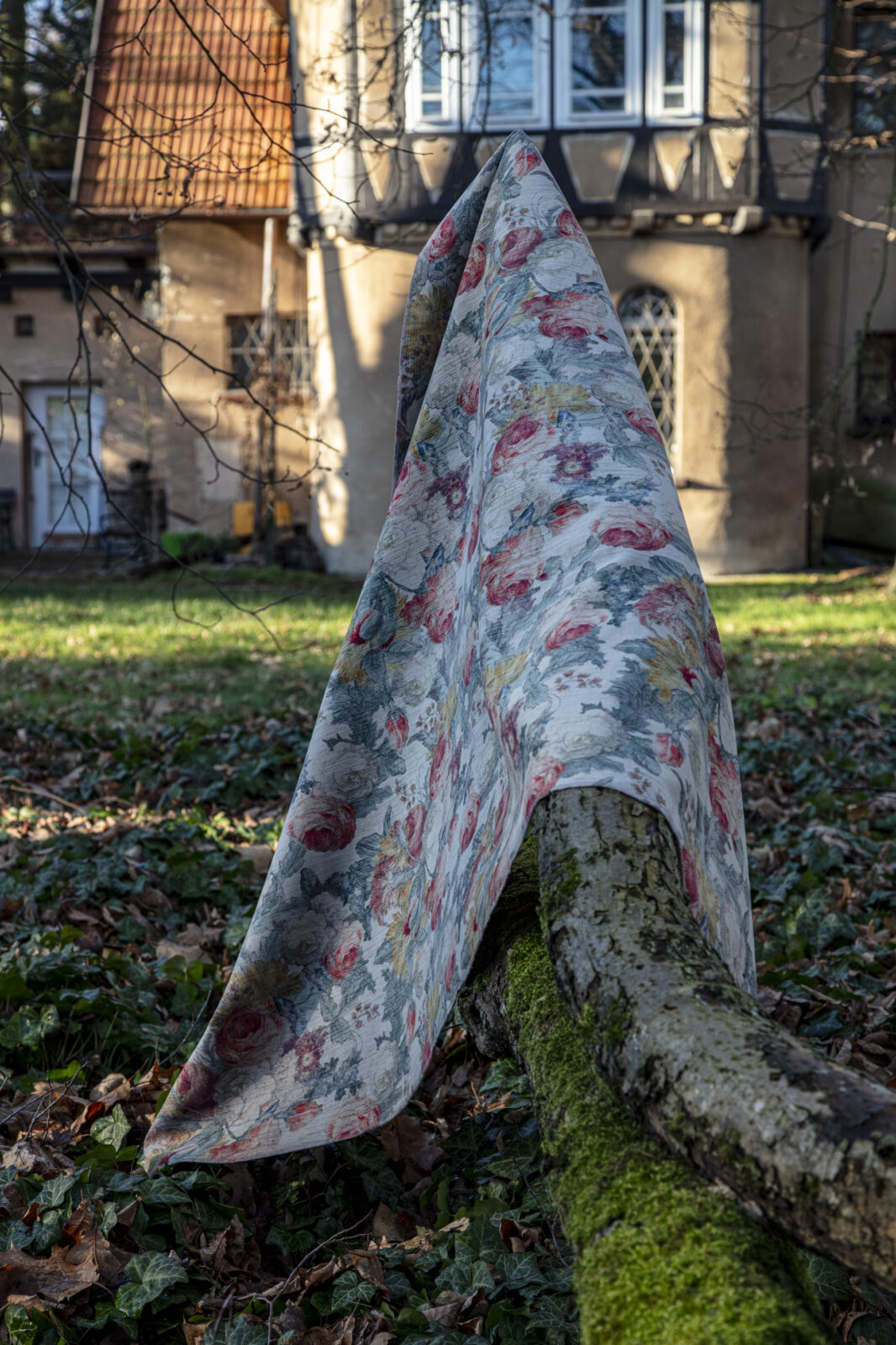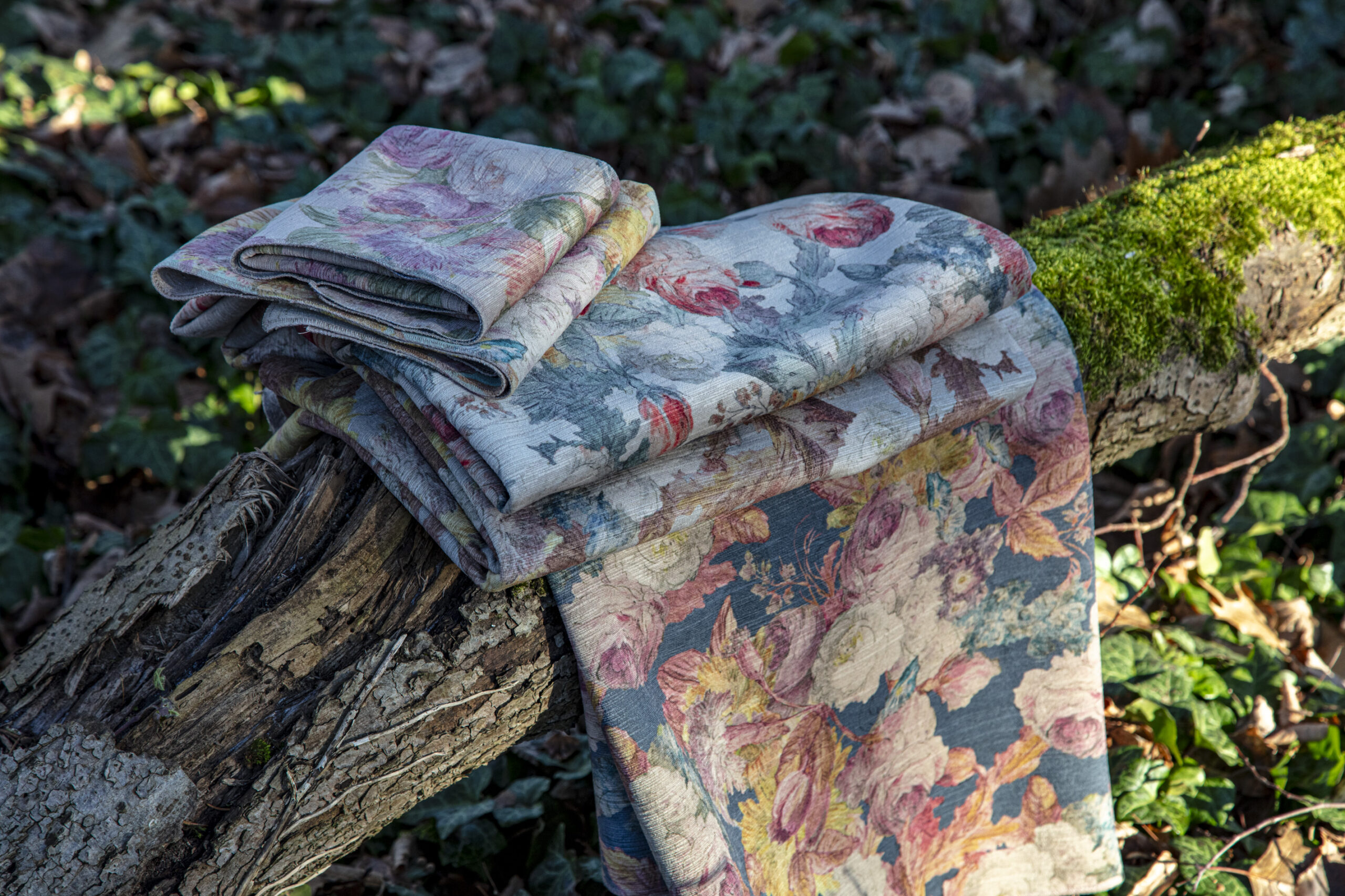 Kolekcja Roseto to dwa dziane welury, które łączy charakterystyczna, prążkowana faktura powierzchni tkaniny. Roseto to welur drukowany w bogaty w detale motyw róż, Fieno to jego jednobarwny koordynat.