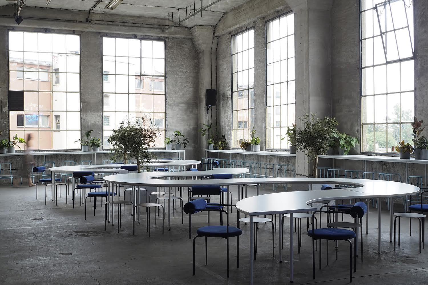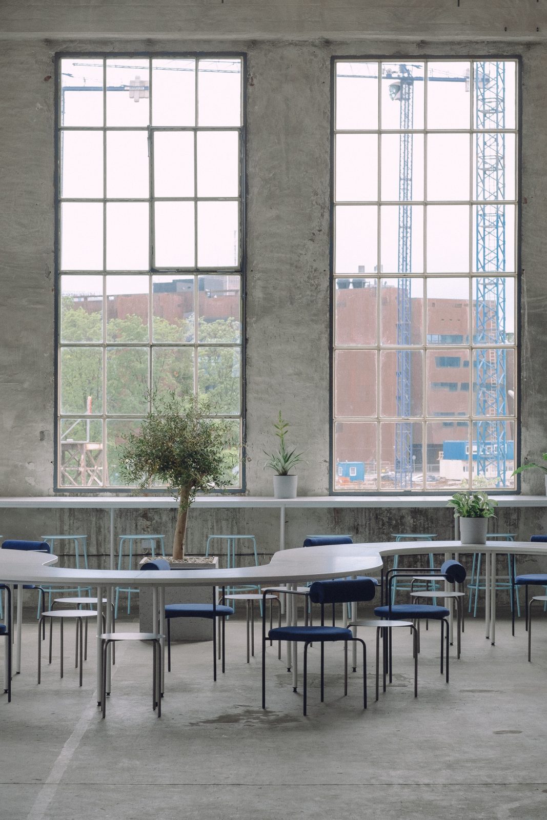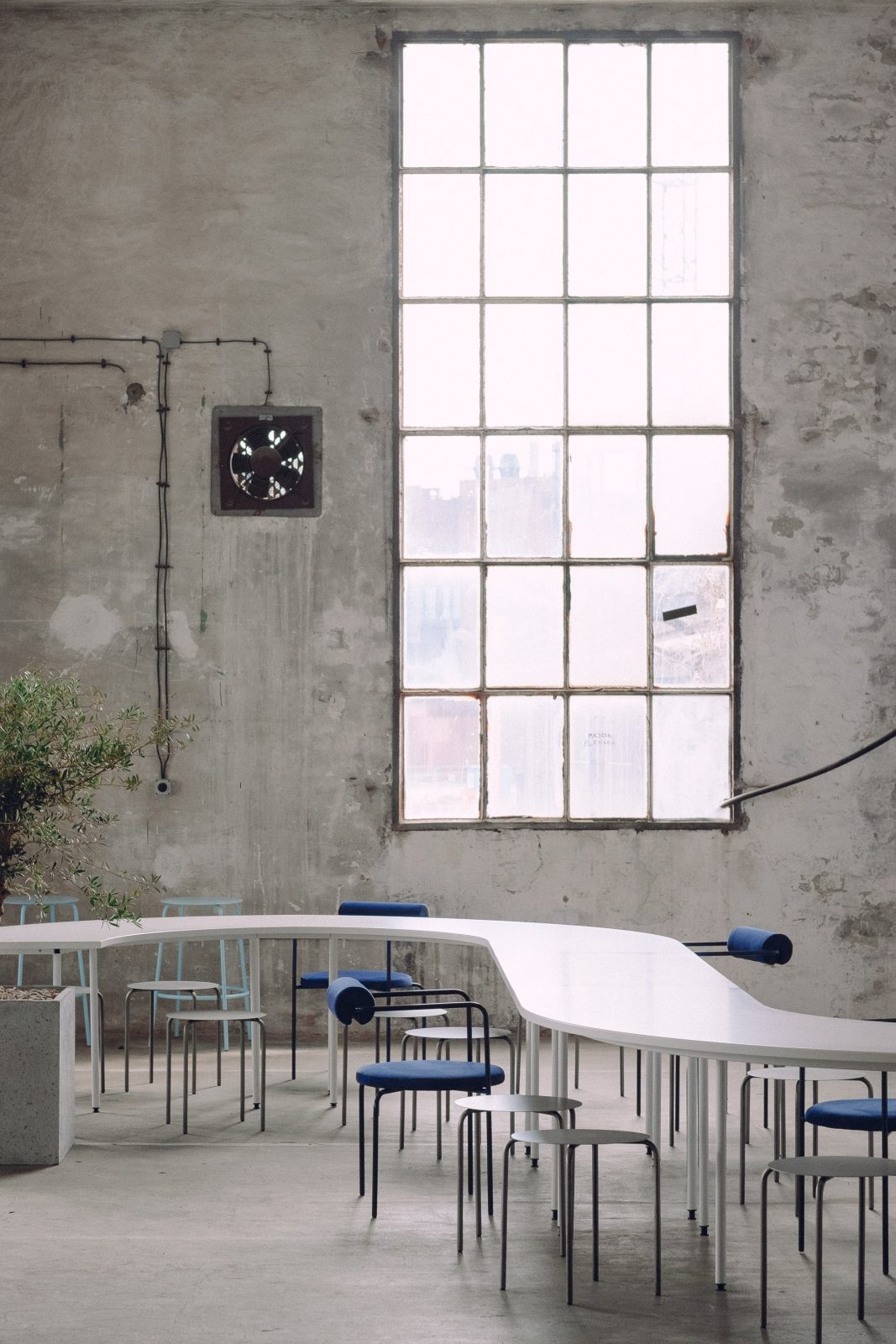 Meble w Plenum są w większości lekkie i minimalistyczne, co podkreśla przestronność wnętrza. Jednym z charakterystycznych elementów wyposażenia są długie, białe stoły o falujących kształtach –przy których goście kawiarni zasiadają na taboretach lub tapicerowanych krzesłach Sage polskiej marki The Good Living Co. Tapicerowane tkanym welurem Henry FR w odcieniu Cobalt 228 siedziska nie tylko zapewniają wygodę, ale także wprowadzają do monochromatycznego wnętrza kolor. Kobalt to barwa zaczerpnięta z identyfikacji wizualnej Plenum – pojawia się także na wyłożonej płytkami ścianie za barem czy na promocyjnych drukach.