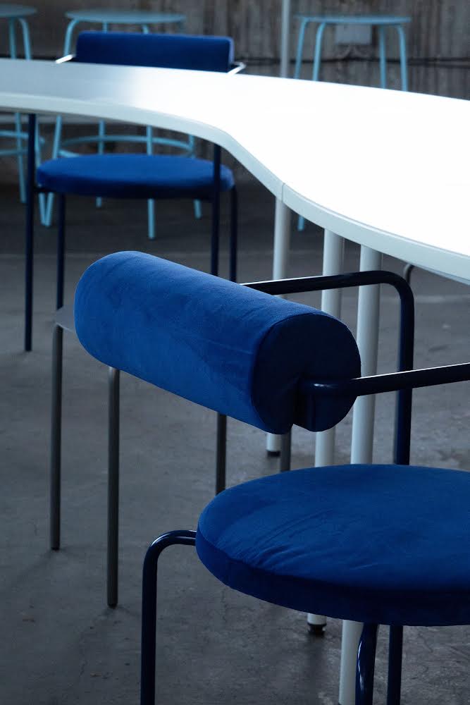 Meble w Plenum są w większości lekkie i minimalistyczne, co podkreśla przestronność wnętrza. Jednym z charakterystycznych elementów wyposażenia są długie, białe stoły o falujących kształtach –przy których goście kawiarni zasiadają na taboretach lub tapicerowanych krzesłach Sage polskiej marki The Good Living Co. Tapicerowane tkanym welurem Henry FR w odcieniu Cobalt 228 siedziska nie tylko zapewniają wygodę, ale także wprowadzają do monochromatycznego wnętrza kolor. Kobalt to barwa zaczerpnięta z identyfikacji wizualnej Plenum – pojawia się także na wyłożonej płytkami ścianie za barem czy na promocyjnych drukach.