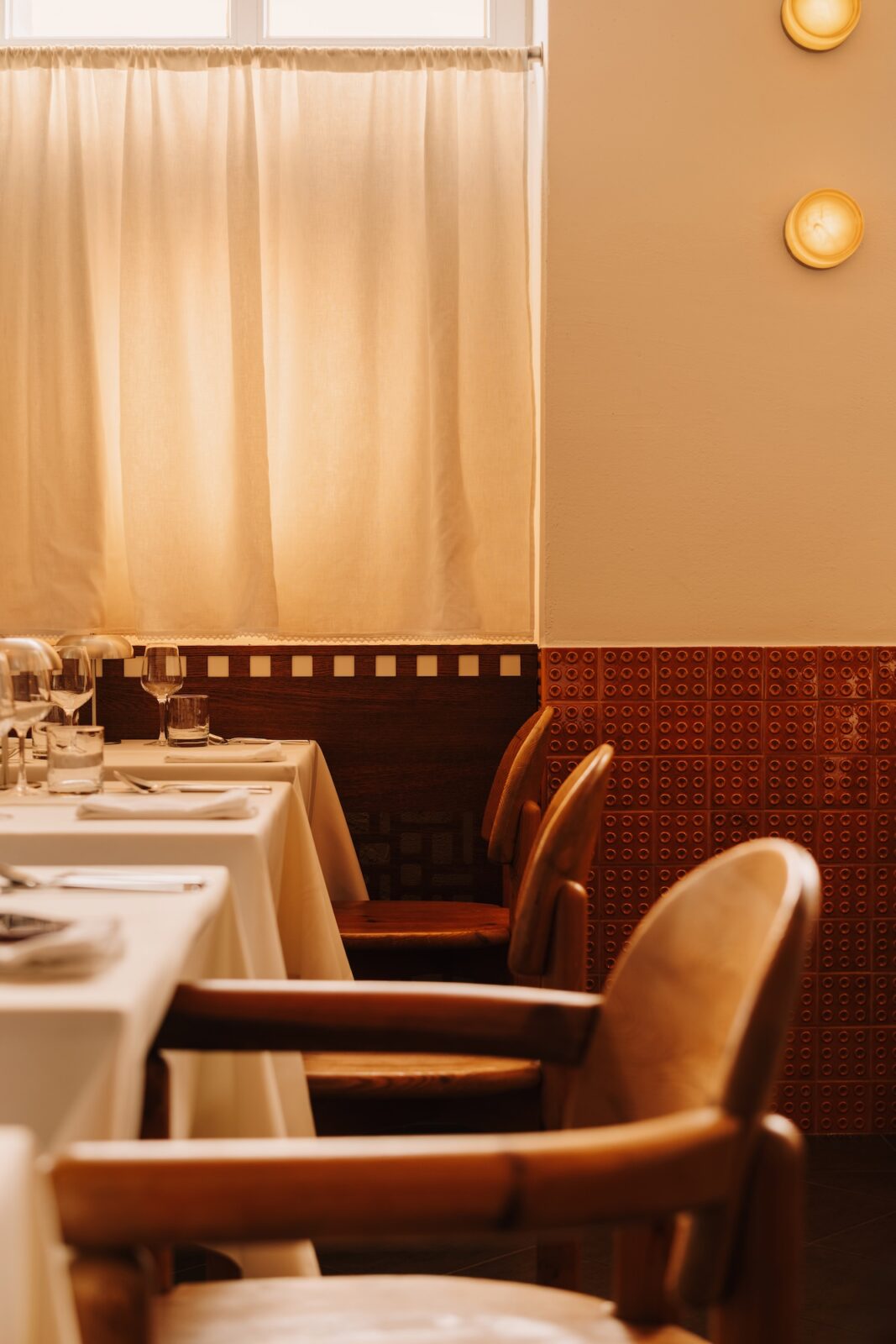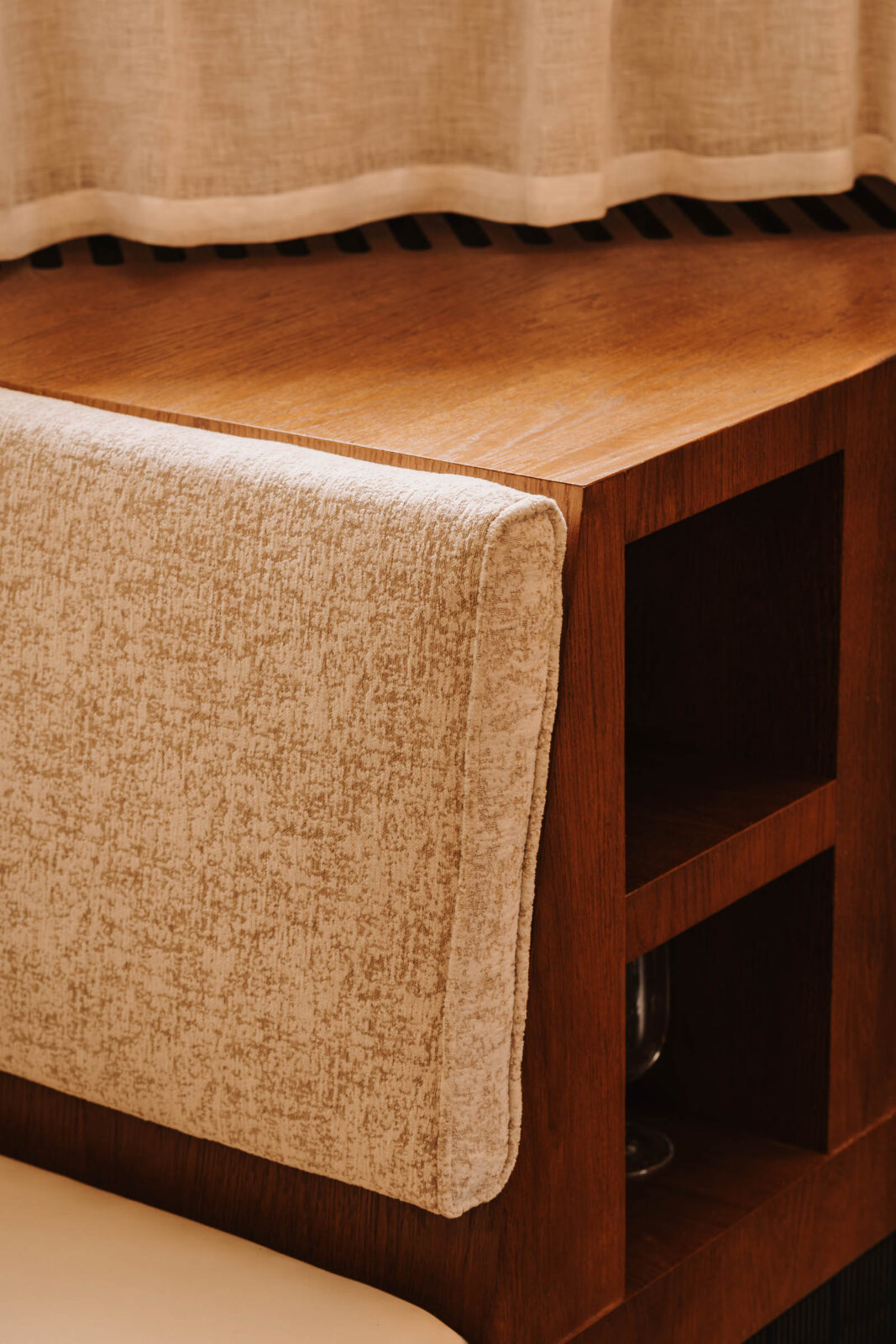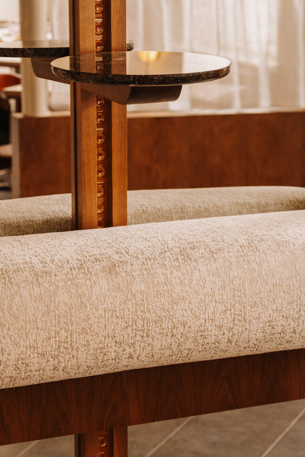 Tkaniny pełnią w Loro różne role: przesłaniają, rozpraszają światło, pokrywają umieszczone wzdłuż ścian fornirowane ławy. W oknach i w kilku innych miejscach można zobaczyć urokliwe „zazdrostki” uszyte z tkaniny Monterosso. Kotara z szenilu Cameron w intensywnym kolorze Tangerine 303 tworzy tło dla okrągłego stołu we wnęce – idealnego na specjalne spotkania i wyjątkowe posiłki. Podświetlona ciepłym światłem tkanina Tela stanowi nie tylko tło dla wyeksponowanych butelek z winem, ale także buduje przytulny klimat. Na ławach użyto jako tapicerkę Ambiente – tkaninę obiciową o marmurkowym wzorze, idealną do intensywnie użytkowanych wnętrz.