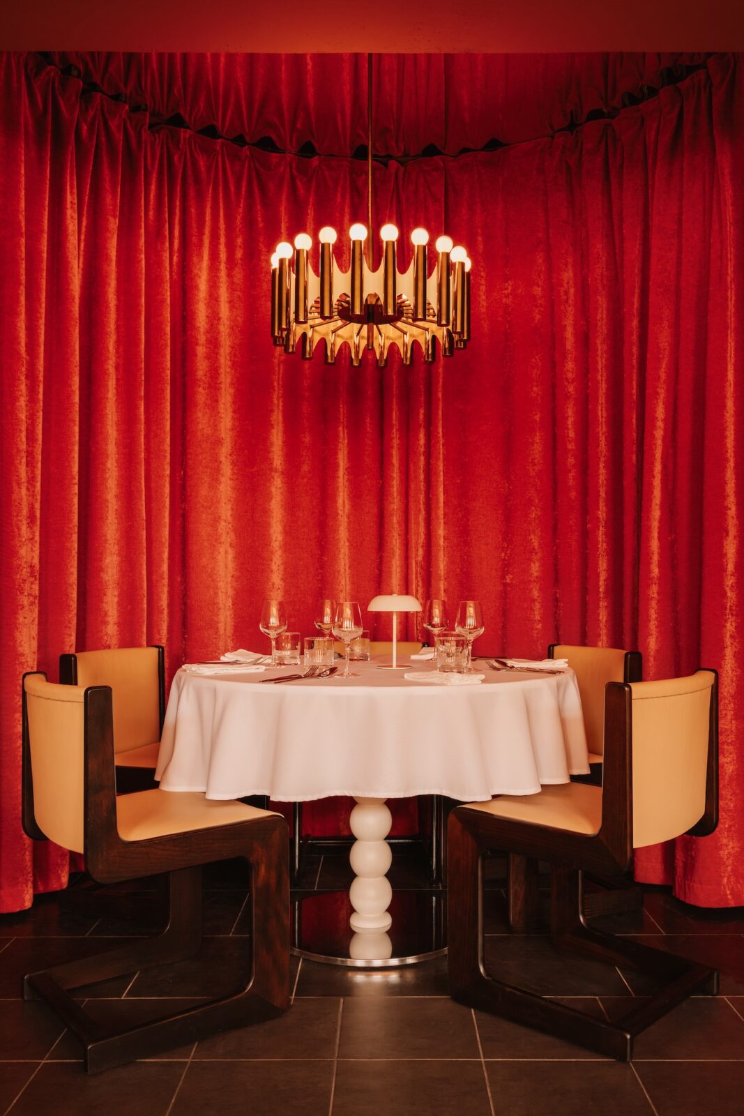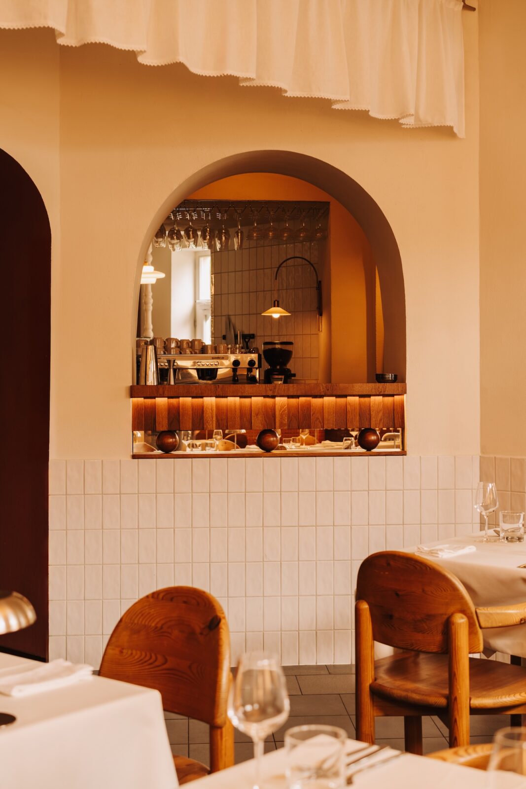 Gości wita replika kuchni z piętnastowiecznej włoskiej willi, znanej z filmu “Call me by your name”. Można wypatrzeć tu czechosłowackie metalowe żyrandole z lat 60. oraz drewniane duńskie i metalowe włoskie krzesła z lat 70. A do tego lampy i meble zaprojektowane przez JEJU studio – wiele z nich łączy motyw lakierowanych lub drewnianych kul. Całość jest bardzo włoska – takie wnętrze mogłoby się swobodnie znaleźć na ulicach Mediolanu czy Rzymu i to nawet już kilka dekad temu.