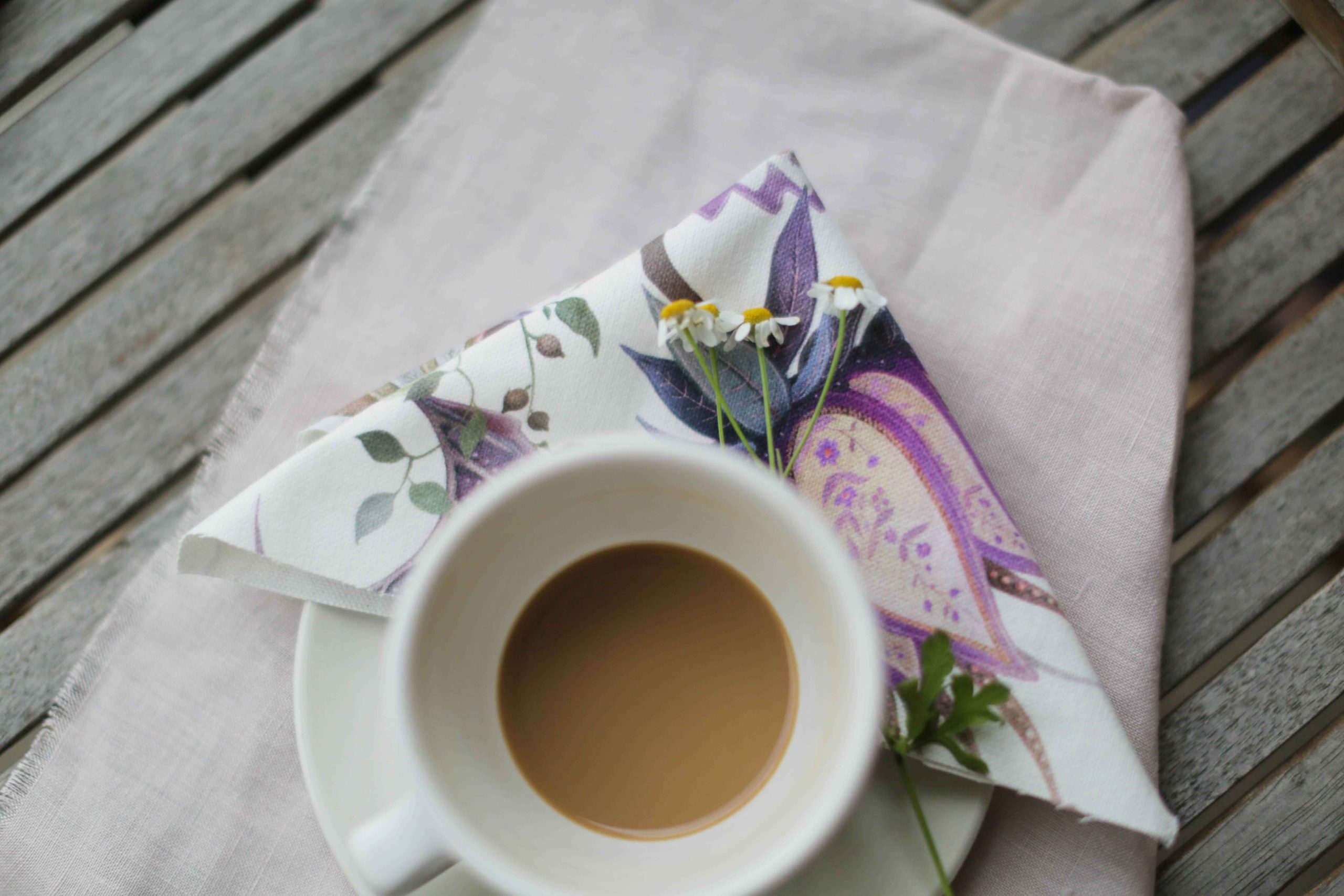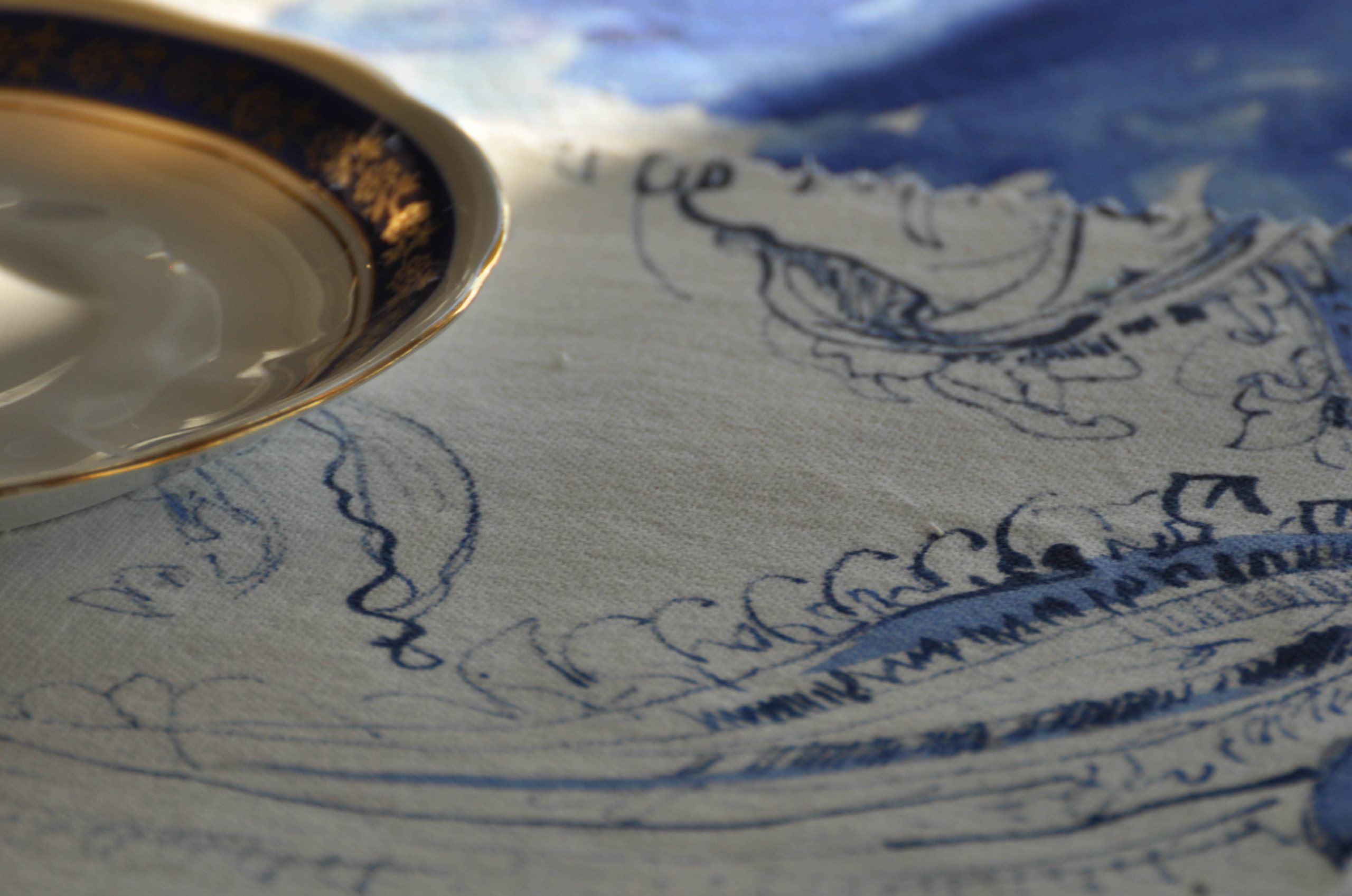 Kolor kobaltowy, znany wszystkim ze sławnych holenderskich fajansów w połączeniu z akwarelową techniką uzupełnioną fragmentami odręcznych konturowych rysunków. Rozsypane na porcelanowo kremowym tle polne i ogrodowe kwiaty przypominają delikatne ceramiczne dekoracje, kojarzące się z kruchością i czystością.