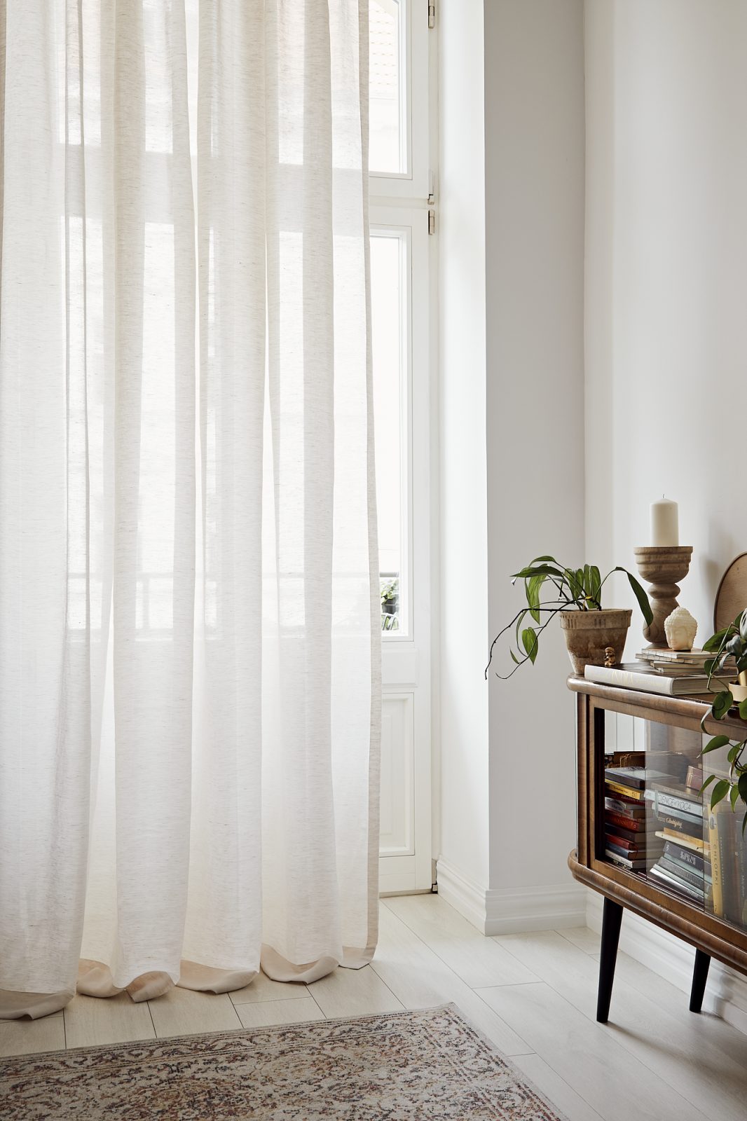 W składzie pół-transparentnej firany Sabbia znajdziemy m. in. włókna lniane i bambusowe. Ta miękka i przyjemna w dotyku tkanina dekoracyjna ma delikatnie widoczny splot i drobne nieregularności przędzy. W dekoracjach okien można ją stosować solo lub łączyć z zasłonami o podobnie surowym, rustykalnym charakterze. Pasuje do wnętrz z dużą ilością naturalnych materiałów i powierzchni, np. rustykalnych, japandi, industrialnych.