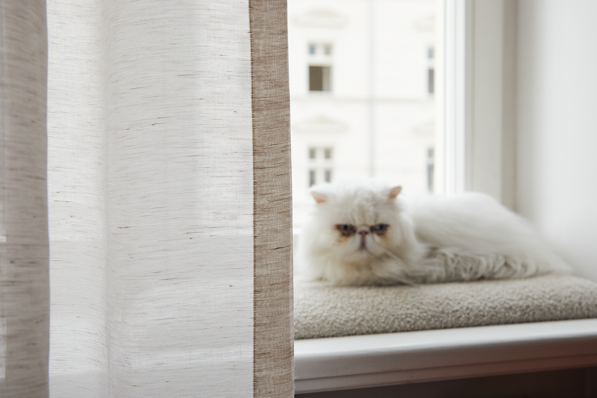 Sabbię można wykorzystywać do dekoracji wysokich pomieszczeń – jest produkowana w szerokości 300 cm. Uszyte z niej firany dobrze się układają dzięki wykończeniu ołowianką.