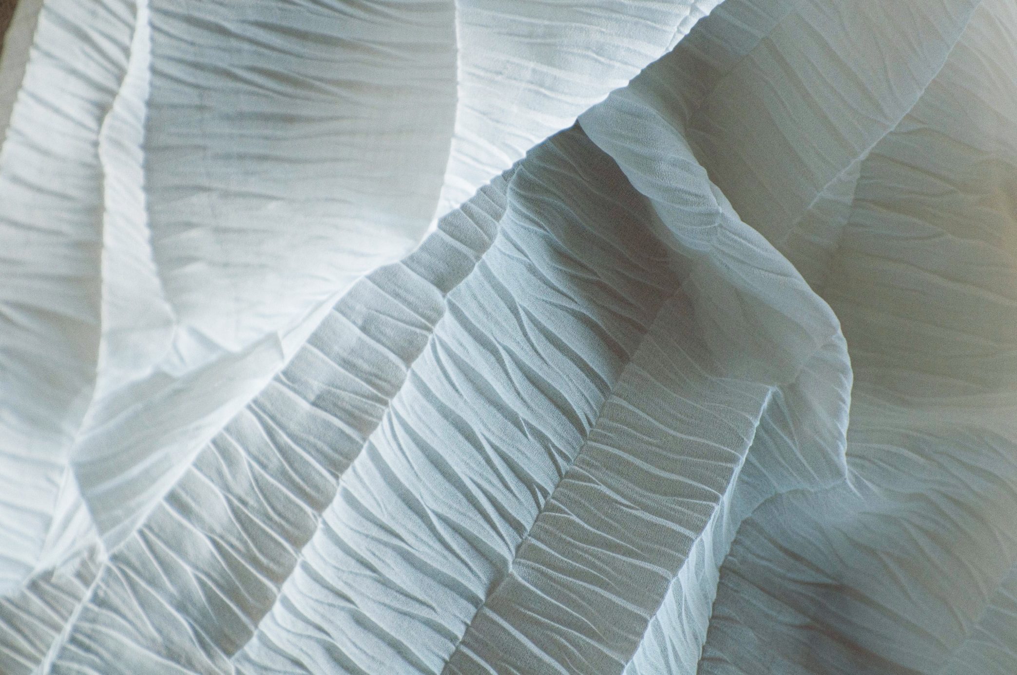 Formowane termicznie, trwale utrzymane na powierzchniach syntetycznych tkanin fałdowania, plisowania, zagniecenia etc., działają intrygująco nie tylko wizualnie, ale także taktylnie. Lubimy dotykać takich materii, śledzić linie, odkrywać zawiłości geometrii.