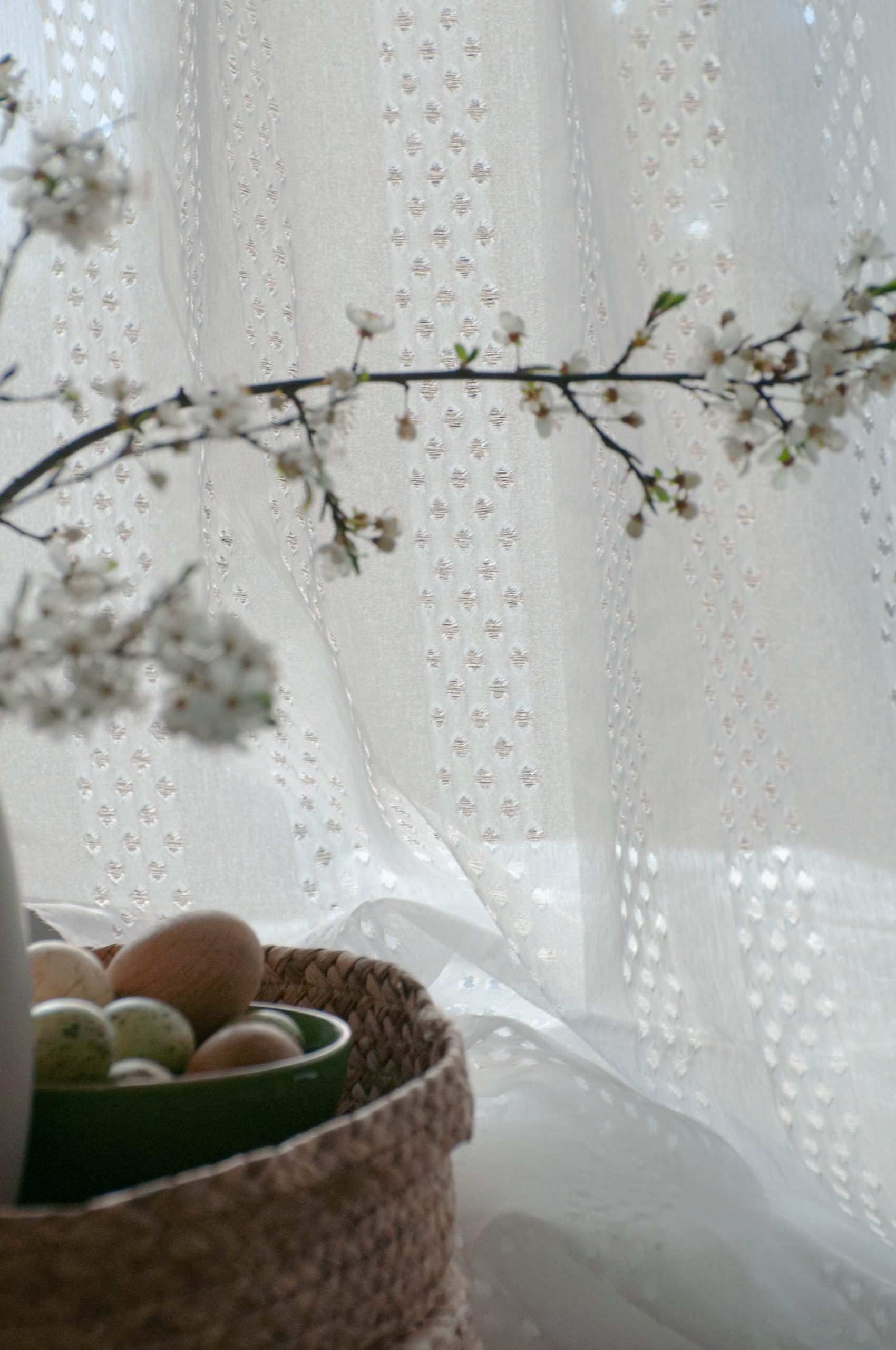 Szczególnie dużo odcieni bieli możemy znaleźć w świecie tekstyliów, a to dlatego, że tekstury i stopień transparentności materiałów wpływają znacząca na nasze postrzeganie. Zabarwione takim samym białym pigmentem włókno, z którego zostanie utkana tkanina, da zupełnie inny efekt w przypadku przędzy bawełnianej, lnianej lub poliestrowej czy wiskozowej. Sposób skręcenia przędzy, rodzaj splotu tkackiego, gęstość materiału czy wreszcie efekt wykończenia, wszystko to każdorazowo da inny odcień bieli. Możliwości te zostały znakomicie wykorzystanie przez przemysł tekstylny w tworzeniu mnogości rozwiązań dla współczesnych wnętrz, szczególnie jeśli chodzi o przesłony okienne, powszechnie nazywane w Polsce firanami. Tkaniny umieszczane w oknach służyć mają intymnemu przysłonięciu wnętrz domów przy jednoczesnym zachowaniu dostępu światła i widoczności tego, co na zewnątrz. Sam tekstylny materiał w tym przypadku zostaje dodatkowo „przefiltrowany” przenikającym przez niego, zależnym od pory dnia i roku, światłem a także ruchem powietrza. Biorąc pod uwagę rozwiniętą dziś technologię, która pozwala na uzyskiwanie różnorakich efektów dekoracyjnych na tkaninach, mamy do wyboru całą masę wzorniczych rozwiązań. Można śmiało założyć, że w tym przypadku naprawdę każdy znajdzie dla siebie coś dostosowanego do jego wymagań użytkowych i upodobań stylistycznych.