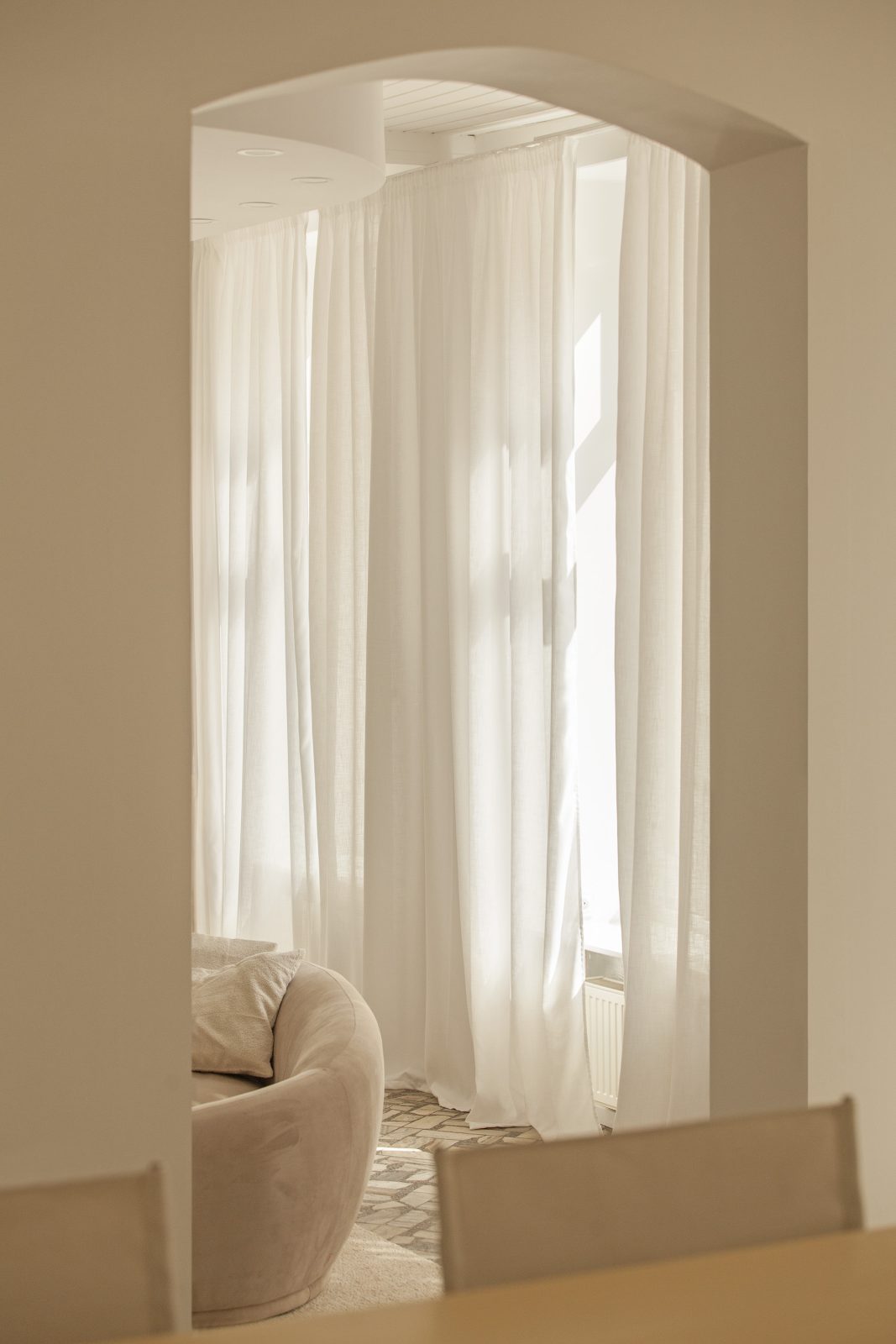 W tym wnętrzu do uszycia dekoracji okien wykorzystano naszą tkaninę dekoracyjną Tela w odcieniu Moonbeam 12. Ten przypominający lniane płótno materiał świetnie nadaje się do dekorowania okien w wysokich, przestronnych pomieszczeniach. Sprawdza się zarówno używany solo, jak i łączony z delikatniejszymi firanami. Z kolei firana Hoshi w odcieniu Sky 36 posłużyła do uszycia kotary oddzielającej kuchenne zaplecze pracowni.