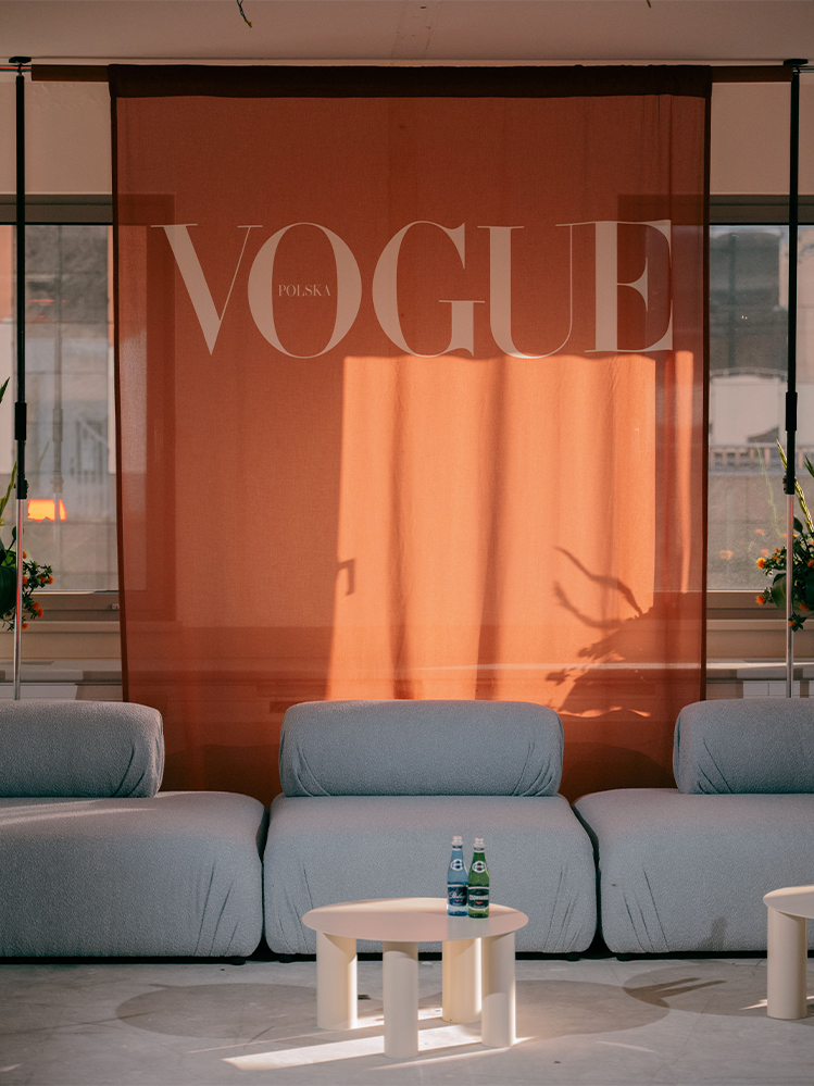 Do aranżacji ekspozycji, zorganizowanej na jednym z pięter biurowca HOP, przekazaliśmy 73m metry tkaniny dekoracyjnej Hoshi w kolorze Ivory. Zwiedzający mogli też zobaczyć cynobrowy tekstylny baner, znany już z 5 urodzin magazynu Vogue Polska, a wykonany z zadrukowanej cyfrowo, transparentnej tkaniny Foga – stanowił on tło dla strefy w której odbywały się panele dyskusyjne.