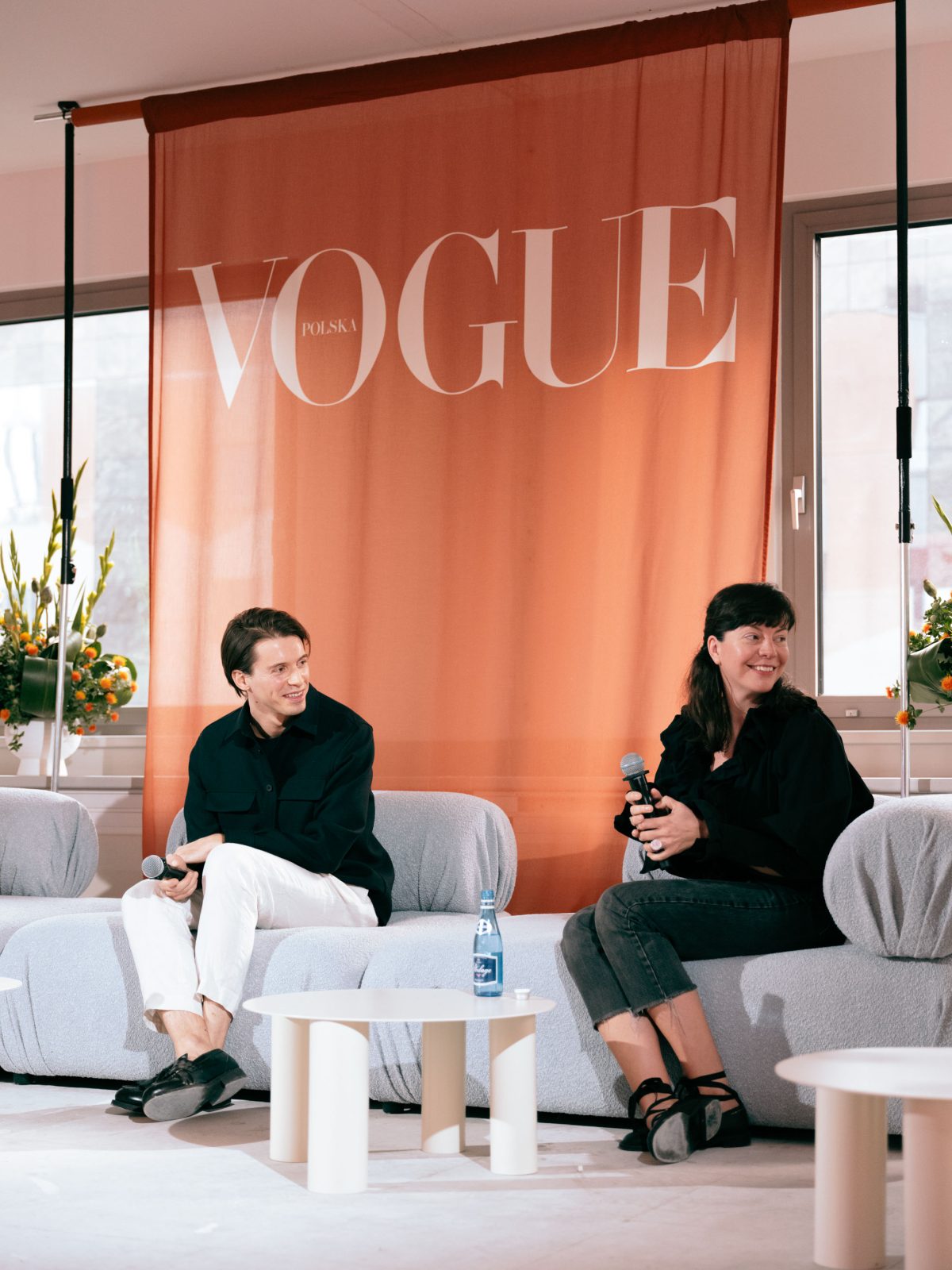 Do aranżacji ekspozycji, zorganizowanej na jednym z pięter biurowca HOP, przekazaliśmy 73m metry tkaniny dekoracyjnej Hoshi w kolorze Ivory. Zwiedzający mogli też zobaczyć cynobrowy tekstylny baner, znany już z 5 urodzin magazynu Vogue Polska, a wykonany z zadrukowanej cyfrowo, transparentnej tkaniny Foga – stanowił on tło dla strefy w której odbywały się panele dyskusyjne.