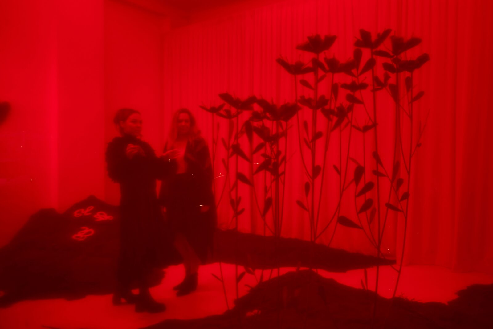 The exhibition’s setting employs the Spring White fabric. It was used to make a curtain, providing a backdrop for the sculptile, 3-D works of Aleksandra Liput. In the colourful light, the white fabric, just like the whole interior of the gallery, takes on the shade of blood red.