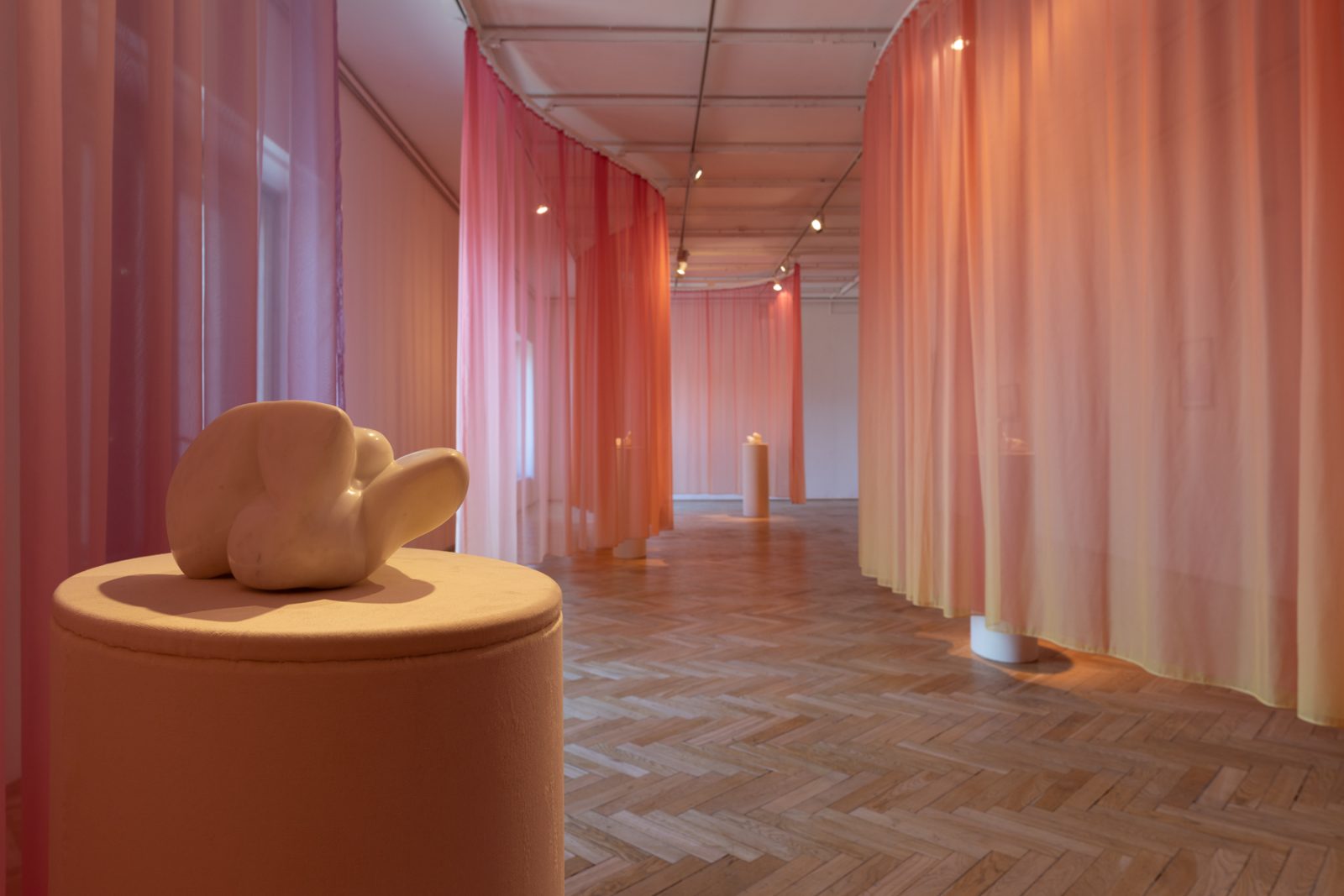 Являясь партнером этого мероприятия, мы безвозмездно передали почти 80 погонных метров тканей. Мягкий классический хлопковый бархат Renard был использован для покрытия постаментов, на которых были выставлены скульптуры Барбары Фалендер из серии Erotic Pillows. С другой стороны, полупрозрачные занавески из вуали «Фарфор», напечатанные по цифровому дизайну Алиции Белавской, создавали в пространстве атмосферу интимности, располагающую к созерцанию смелых, чувственных скульптур, откровенно рассказывающих о женской сексуальности.