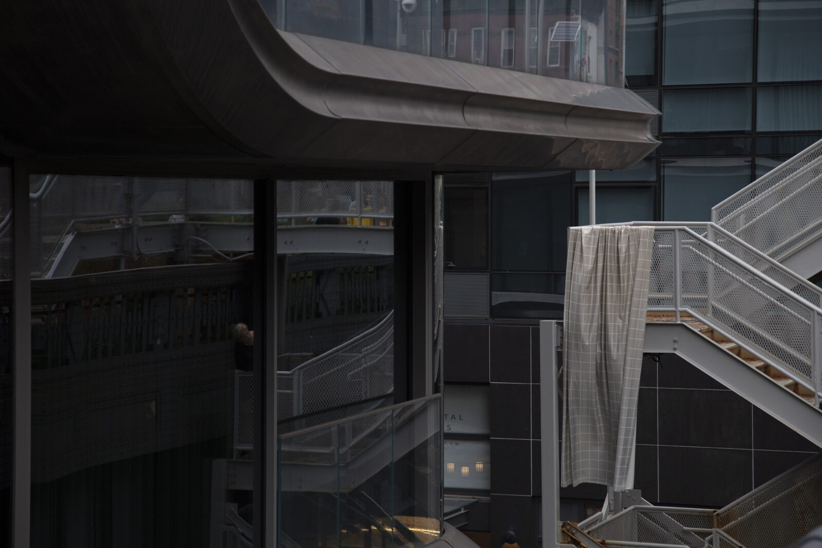 Правильные деления стеклянных фасадов небоскребов органично сочетаются с геометрической сеткой узора. Сама структура эстакады Хай-Лайн также выступает элементом сценографии сеанса. High Line Park — уникальный проект ревитализации городского пространства — результат работы архитектурной студии Diller Scofidio+Renfro и выдающихся дизайнеров озеленения: Пита Удольфа и Джеймса Корнера. Открытый в 2009 году, он быстро стал одной из самых важных туристических достопримечательностей Нью-Йорка, ежегодно привлекая несколько миллионов посетителей, очарованных сочетанием архитектуры и натуралистических насаждений.