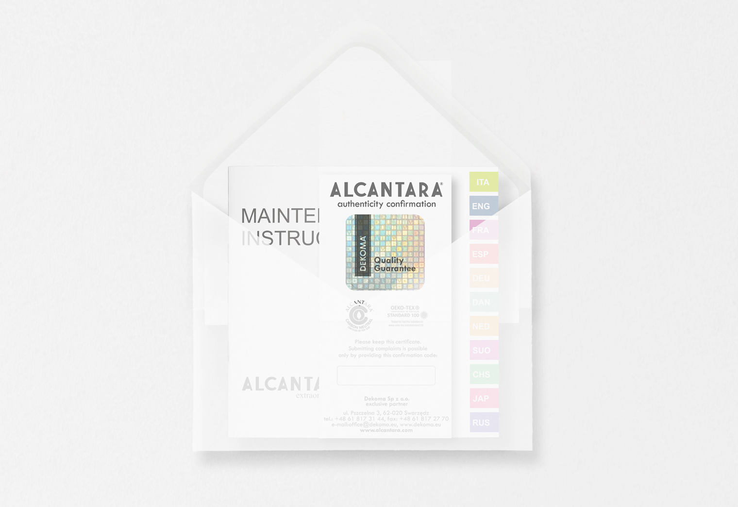 Сертификат и инструкция по очистке упакованы в полупрозрачный конверт, который мы добавляем к каждому заказу Alcantara.