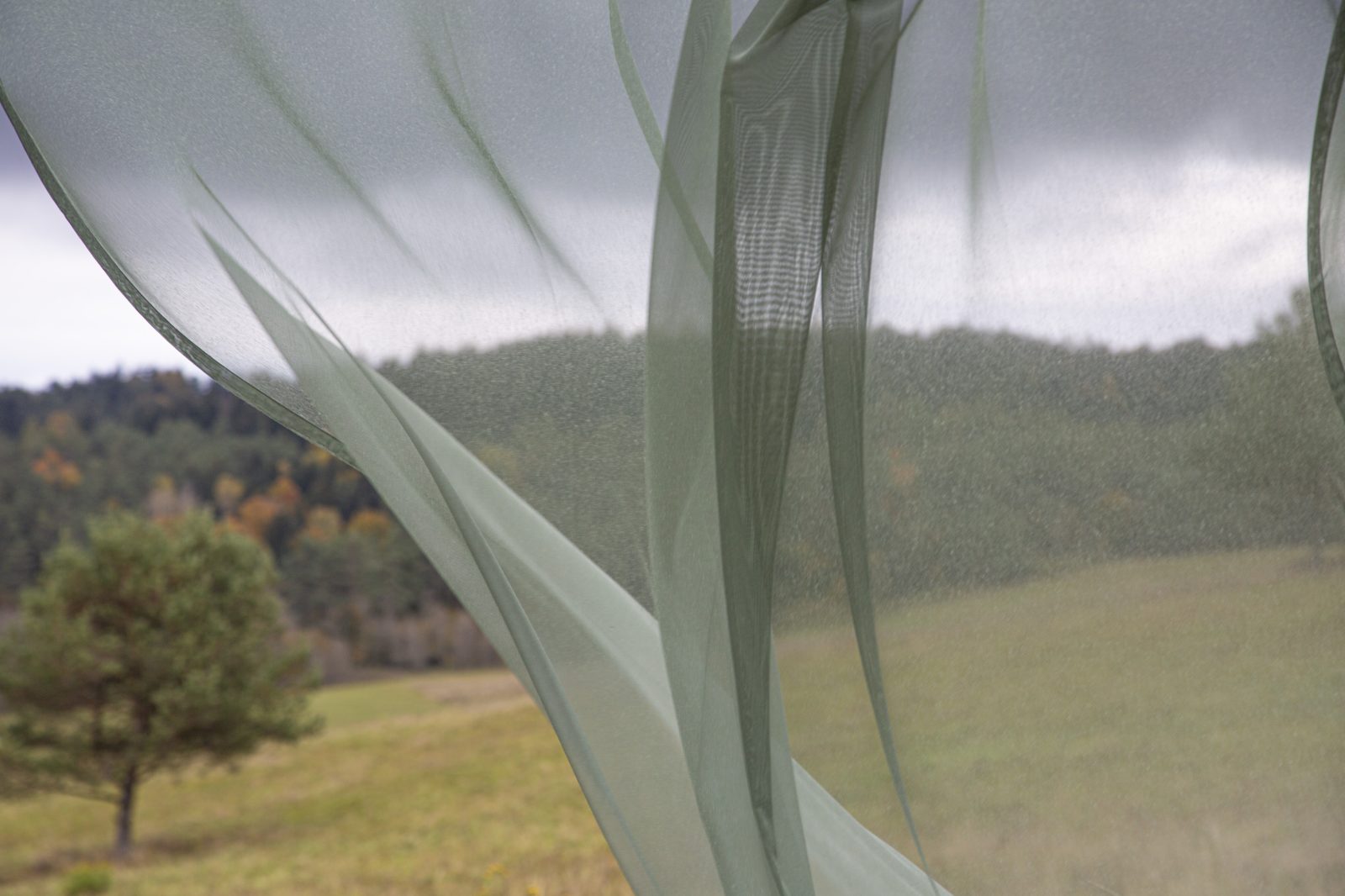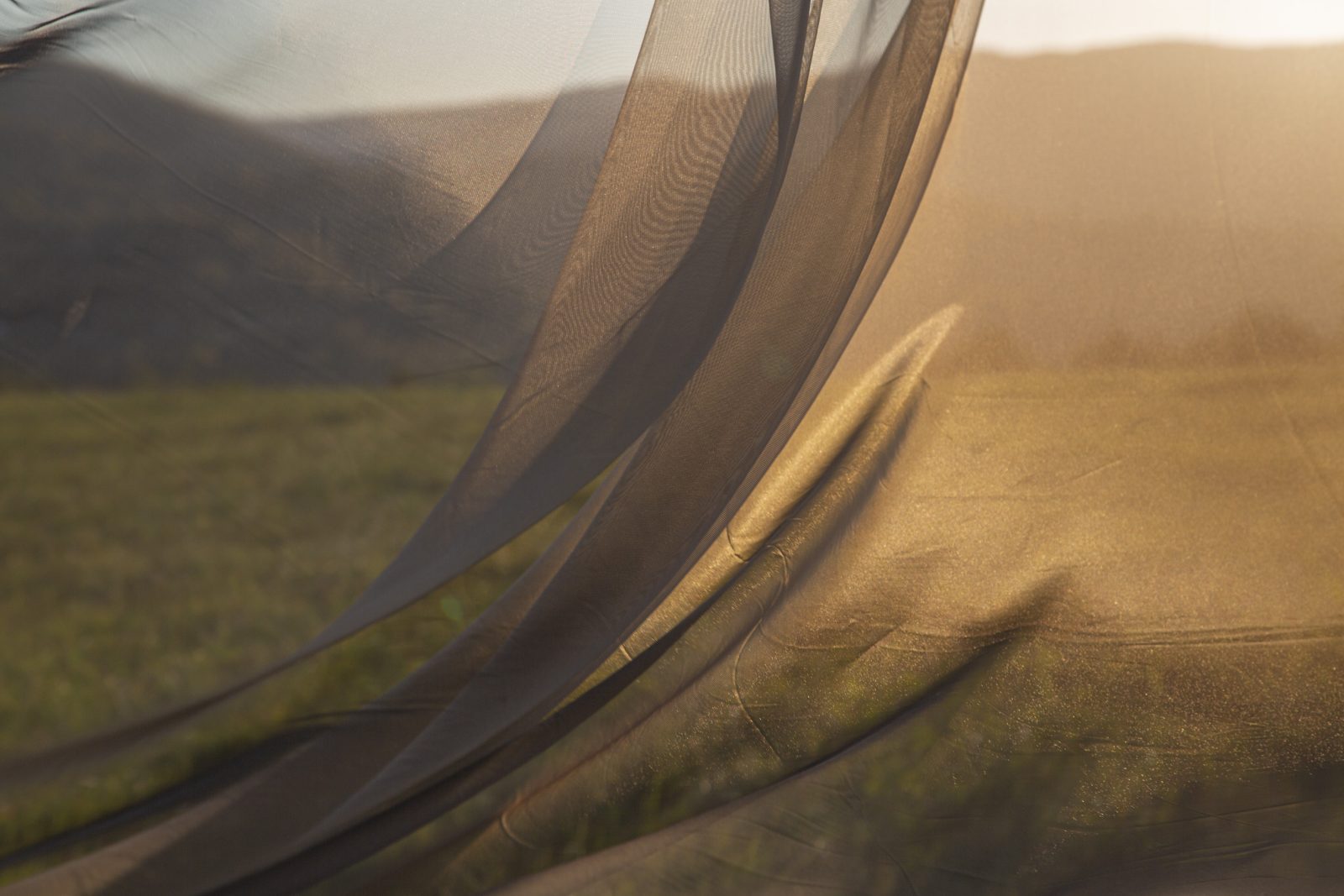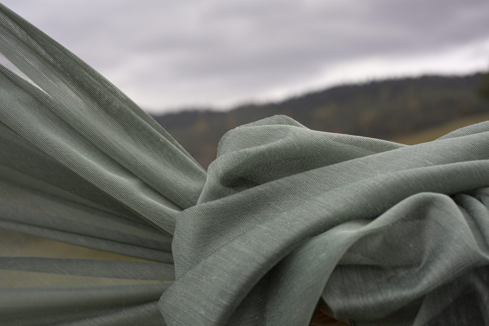 Воздух определенно её стихия. Ткань оживает в нём, показывает своё самое прекрасное лицо, меняет цвет и интенсивность, делая его неотразимым перед своим очарованием. Прозрачность гор служит ей лучше всего. В своей силе ткань переливается и смягчается, пока не кажется, что исчезает в пространстве. Она становится незаметной, даже прозрачной. В отблесках света и воздуха можно обнаружить тонкие, иногда даже микроскопические, линии основы и утка в её деликатных переплетениях.