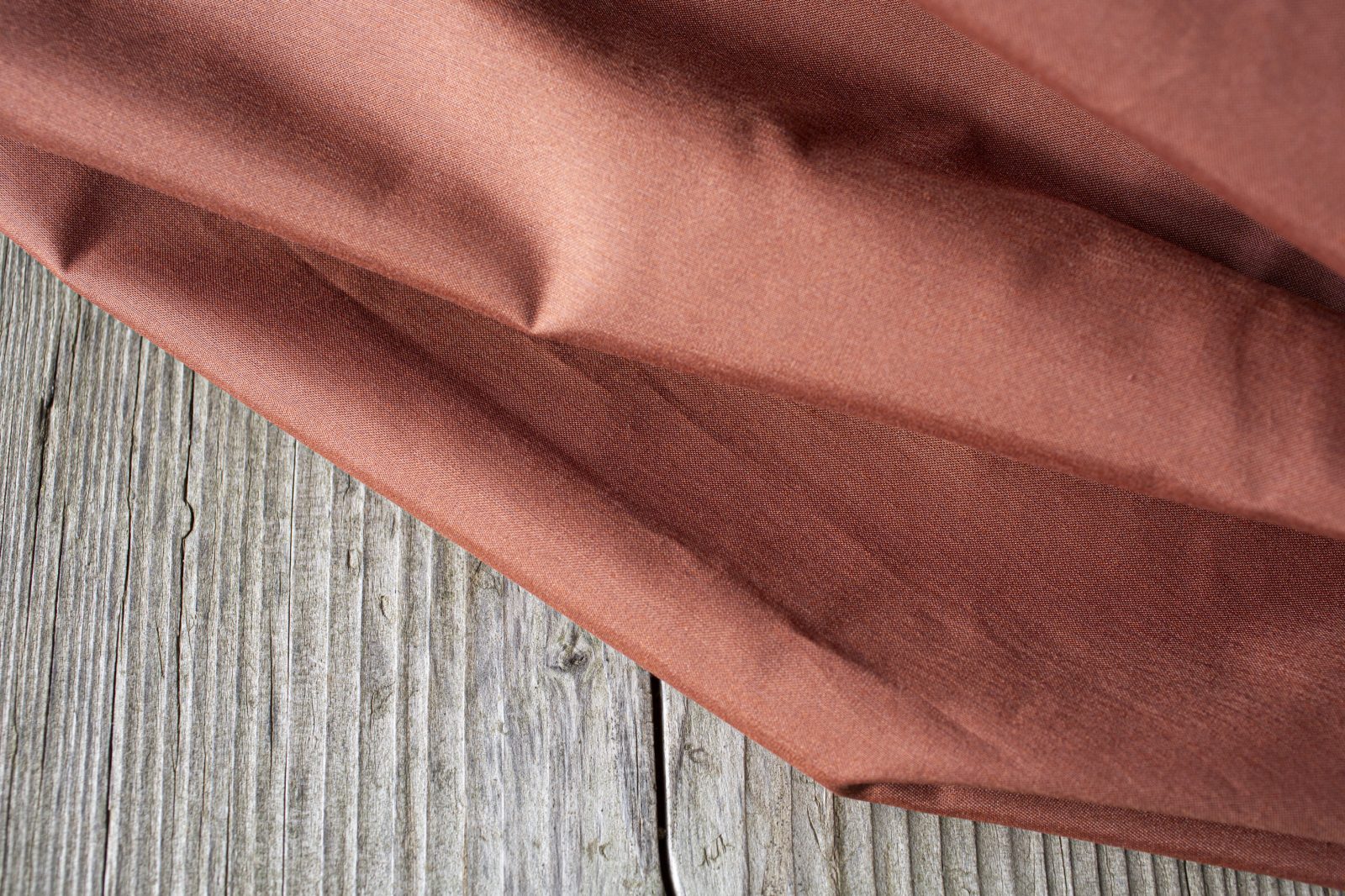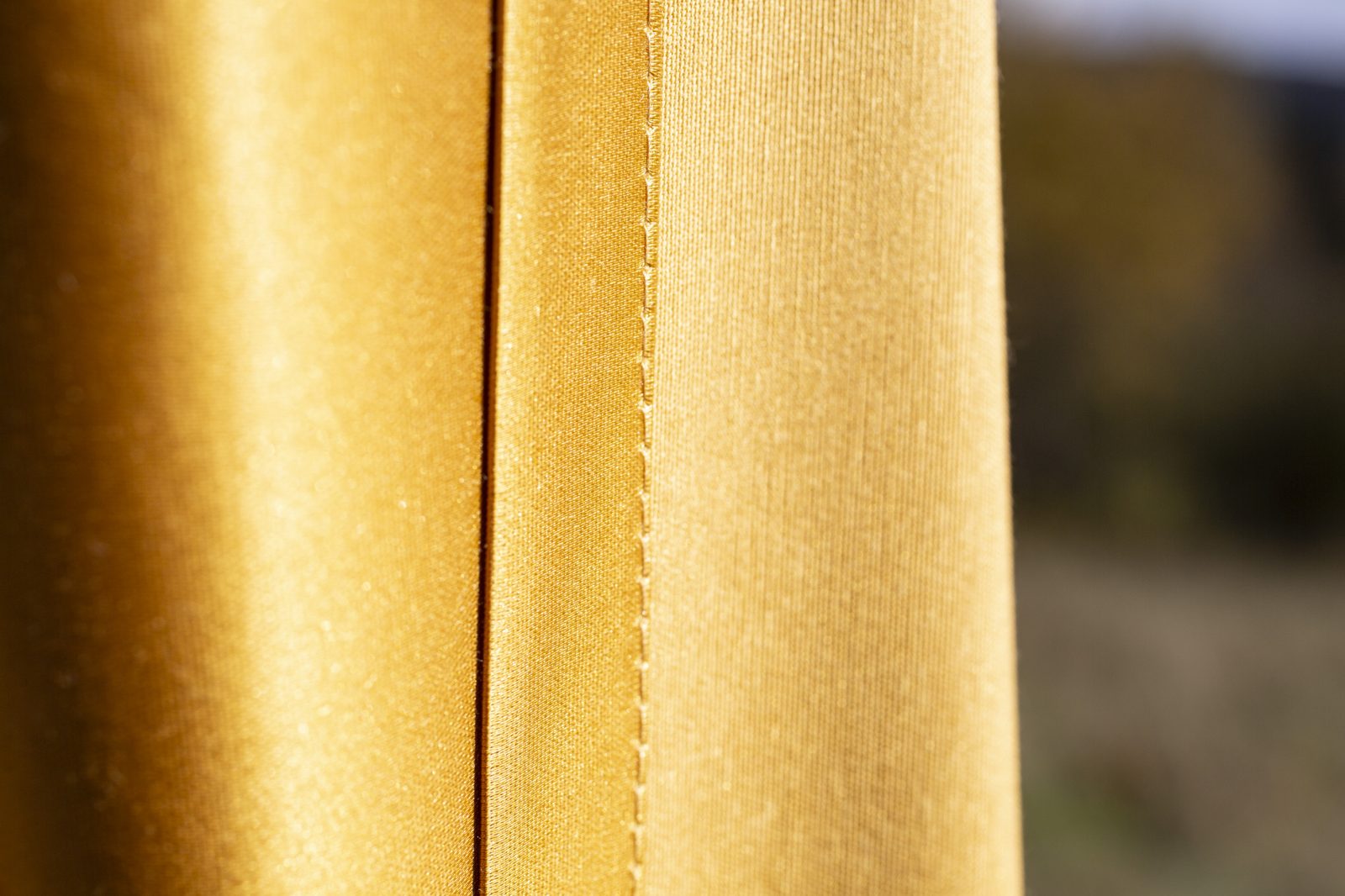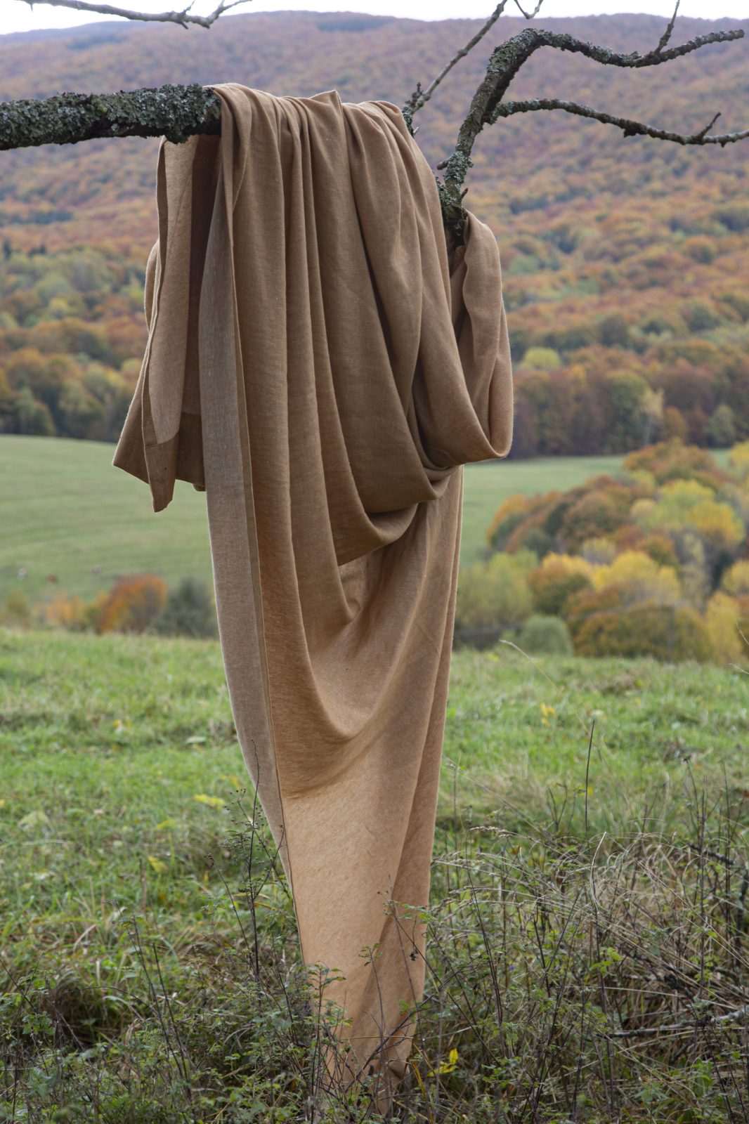 Блестящий сатин иначе реагирует на свет и тень, чем матовый жоржет. Горные пейзажи, погруженные в туманное сияние, покрыты тканевыми драпировками. Ткань впитывала свет и сливалась с осенними красками фона. Иногда она сверкала, как настоящее золото, отражая богатство природы. Одна и та же фактура, один и тот же цвет могли удивить в зависимости от времени суток и зрелища в небе Бещад.