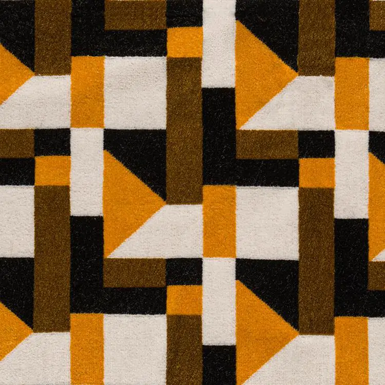 Сложный геометрический рисунок этого велюрового жаккарда вызывает ассоциации с современной архитектурой и объемными фасадами зданий. Регулярно повторяющиеся формы контрастных цветов создают впечатление динамичного движения, или огней города, видимых ночью из движущегося автомобиля.Ткань прочная, имеет плотное плетение и плотное прилегание. Её узор в сочетании с цветовой гаммой коллекции Moquette эффективно скрывает видимые признаки износа.