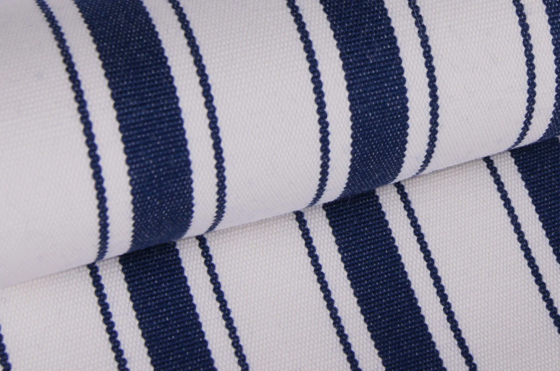 Matowa tkanina w niebieskie pasy na białym podładzie.Tkaniny UV Pro posiadają ochronę przed promieniami słonecznymi . Zalety techniczne pozwalają na zastosowanie ich na wolnym powietrzu: na meble ogrodowe, basenowe, leżaki, parasole przeciwsłoneczne, żaluzje, markizy, meble jachtowe. Posiadają certyfikat OEKO-TEX® Standard 100 dający gwarancję produktu bezpiecznego w kontakcie z ludzką skórą. Produkt na zamówienie w minimalnej ilości 0,5 metra.