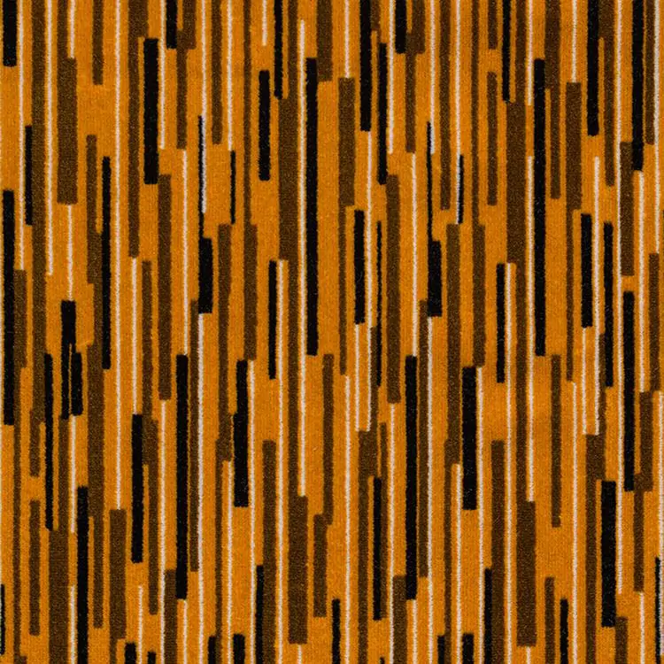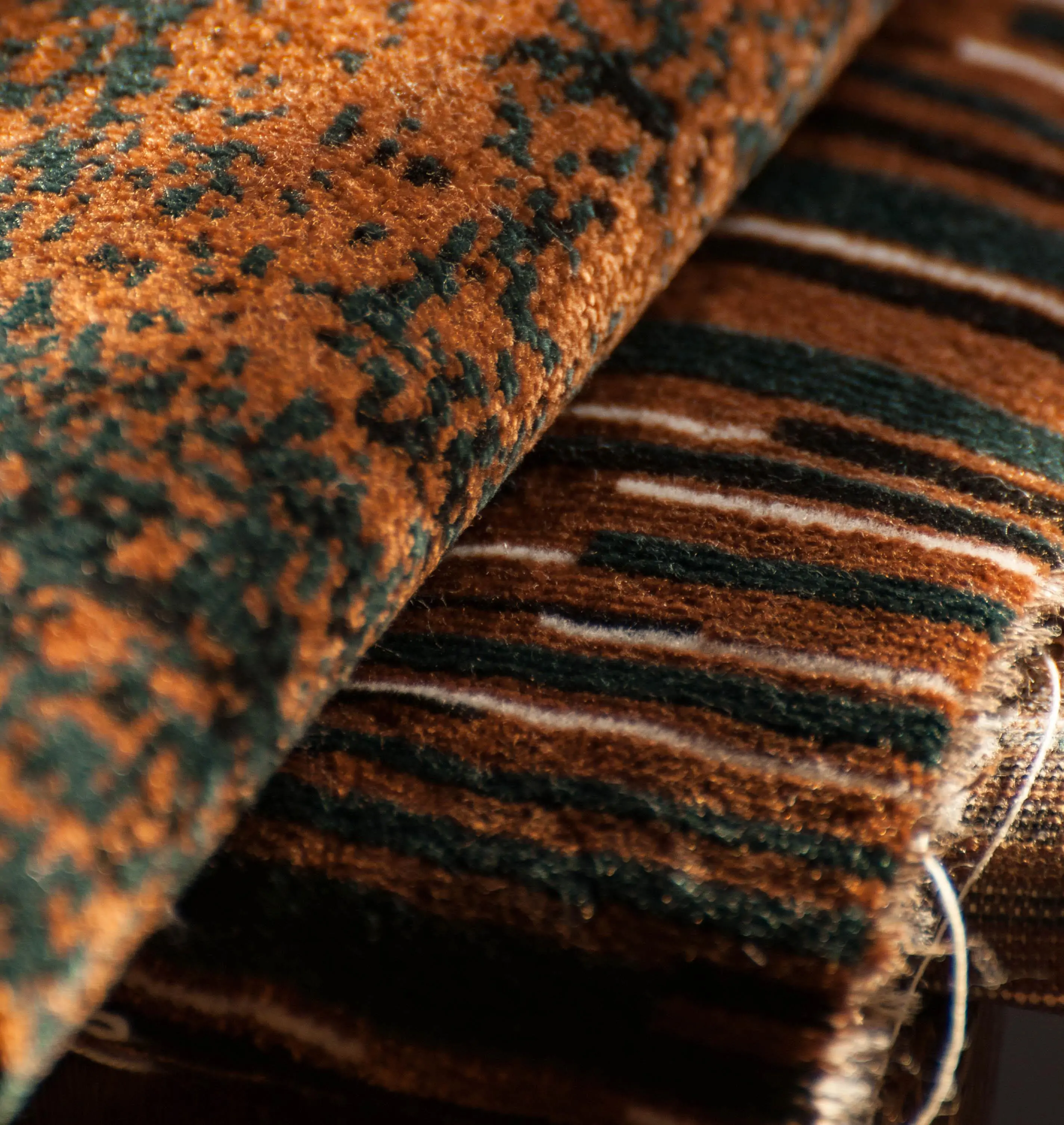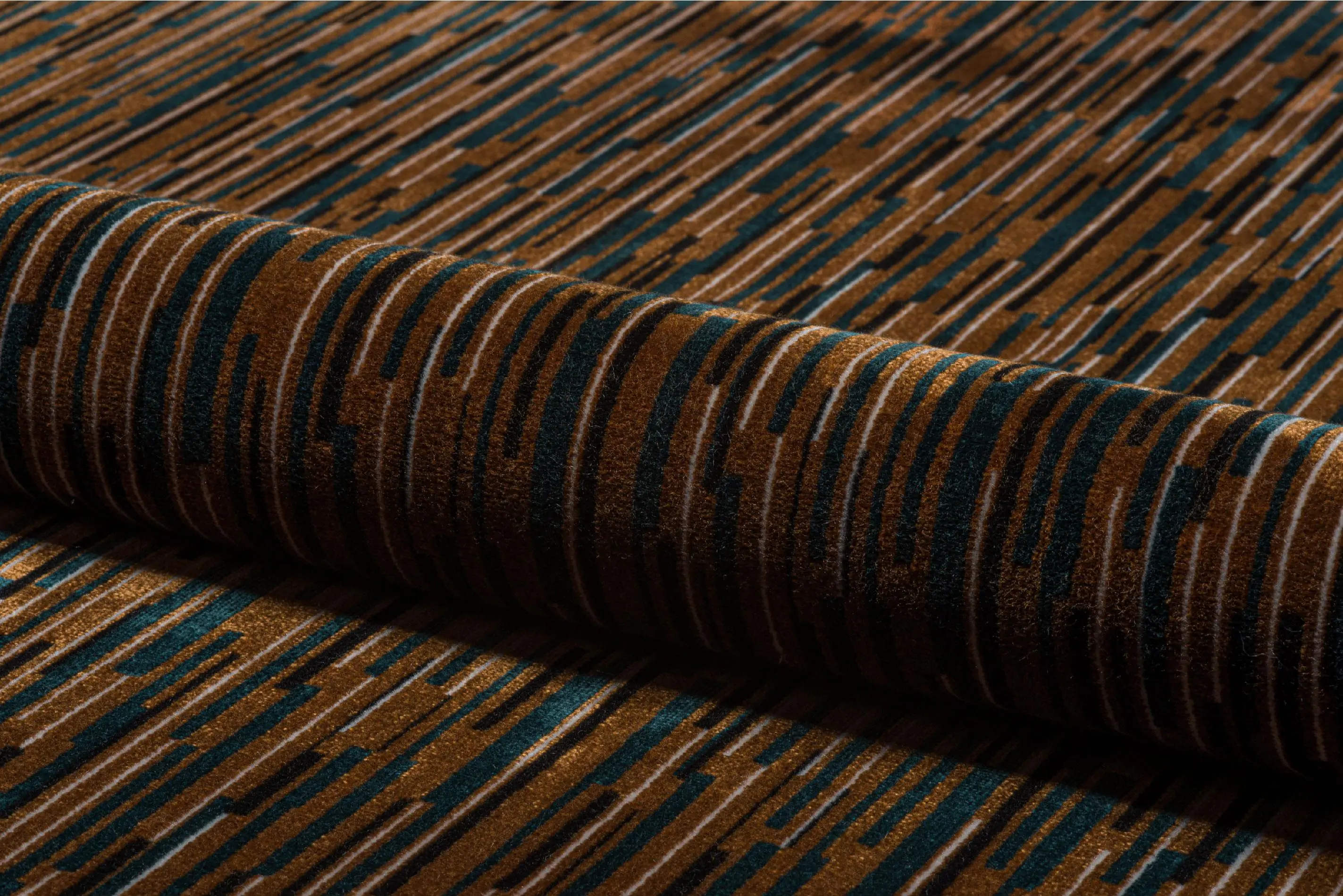 Welurowy żakard z kolekcji „Moquette” to ze wzorem w formie pasów Jest miękka w dotyku ze względu na welurowe wykończenie. Liczne i dość drobne, nieregularne prostokąty, z jednej strony wyglądają jak bardzo złożony, geometryczny deseń, a z drugiej mogą kojarzyć się z przekrojem skały łupkowej. Taki wzór w połączeniu z sześcioma intensywnymi kolorami, sprawiają, że na tkaninie długo nie widać zabrudzeń i śladów zużycia.