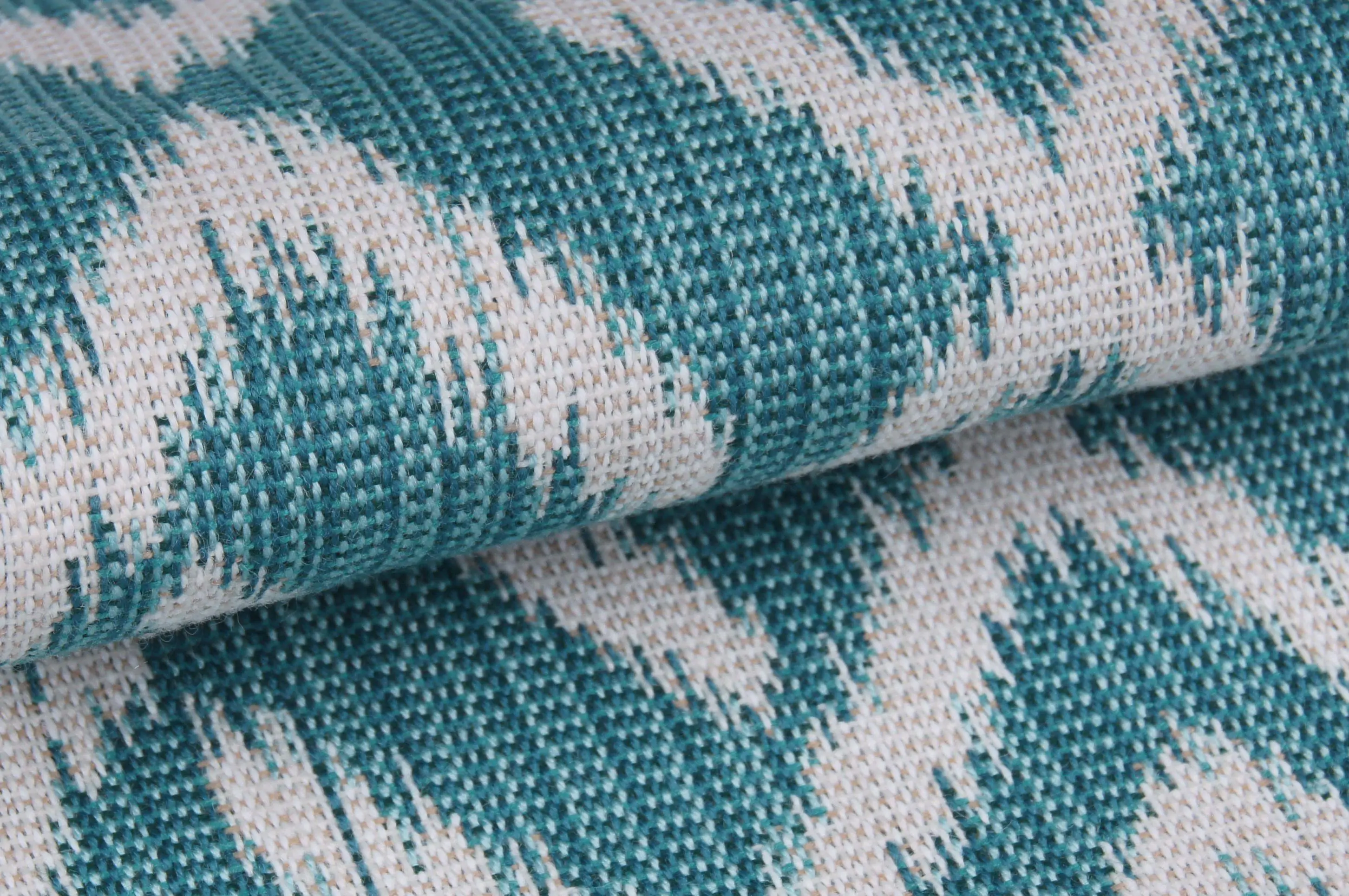 Tkanina z motywm ikat. Żakardowo tkana z 3 kolorów przędzy. Tkaniny UV Pro posiadają ochronę przed promieniami słonecznymi . Zalety techniczne pozwalają na zastosowanie ich na wolnym powietrzu: na meble ogrodowe, basenowe, leżaki, parasole przeciwsłoneczne, żaluzje, markizy, meble jachtowe. Posiadają certyfikat OEKO-TEX® Standard 100 dający gwarancję produktu bezpiecznego w kontakcie z ludzką skórą. Produkt na zamówienie w minimalnej ilości 0,5 metra.